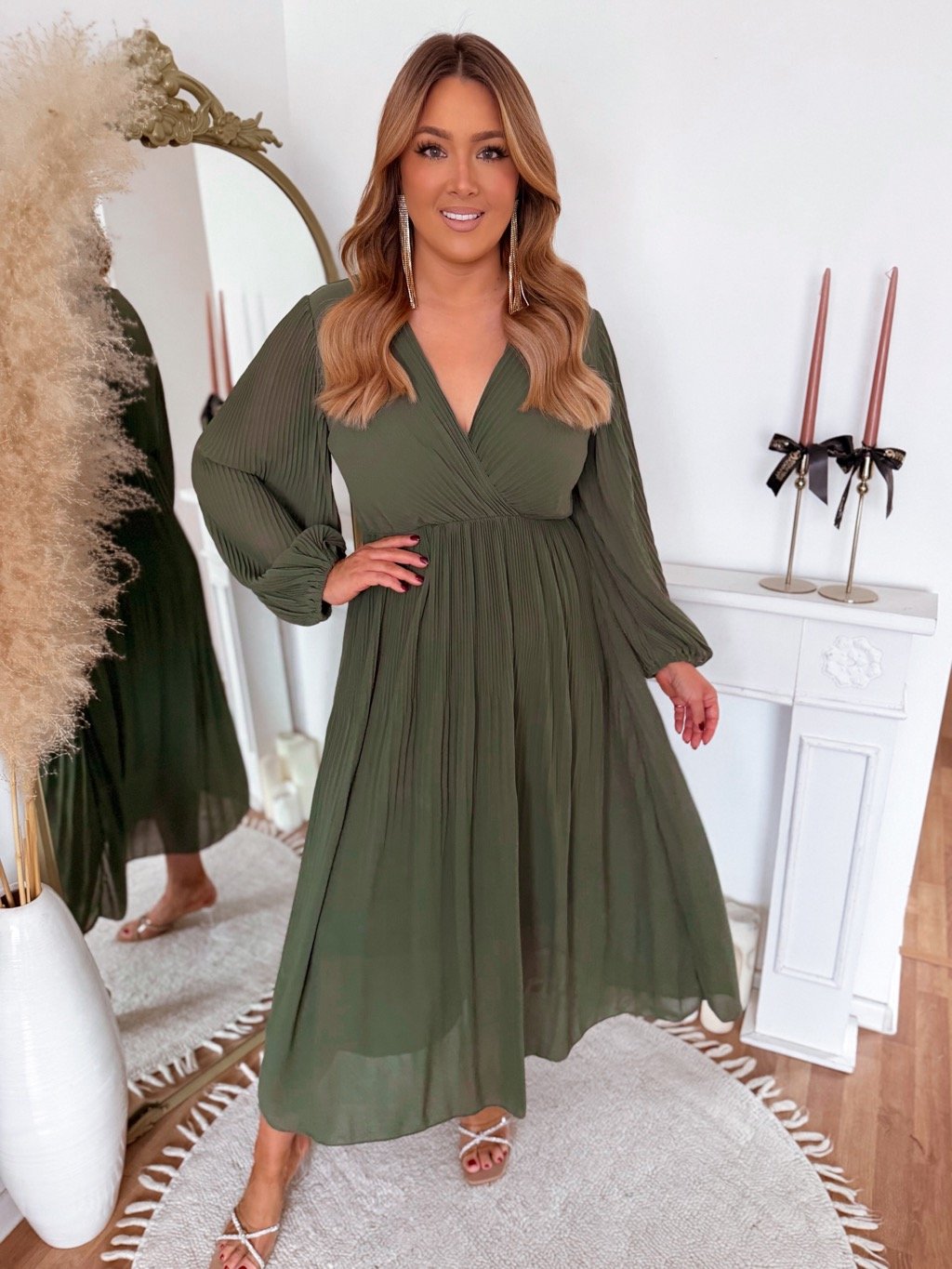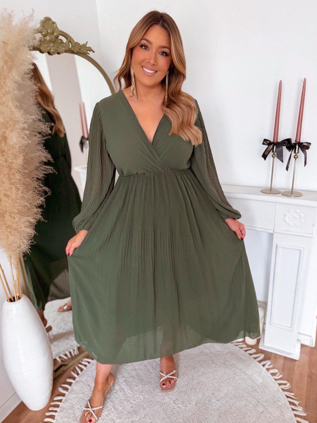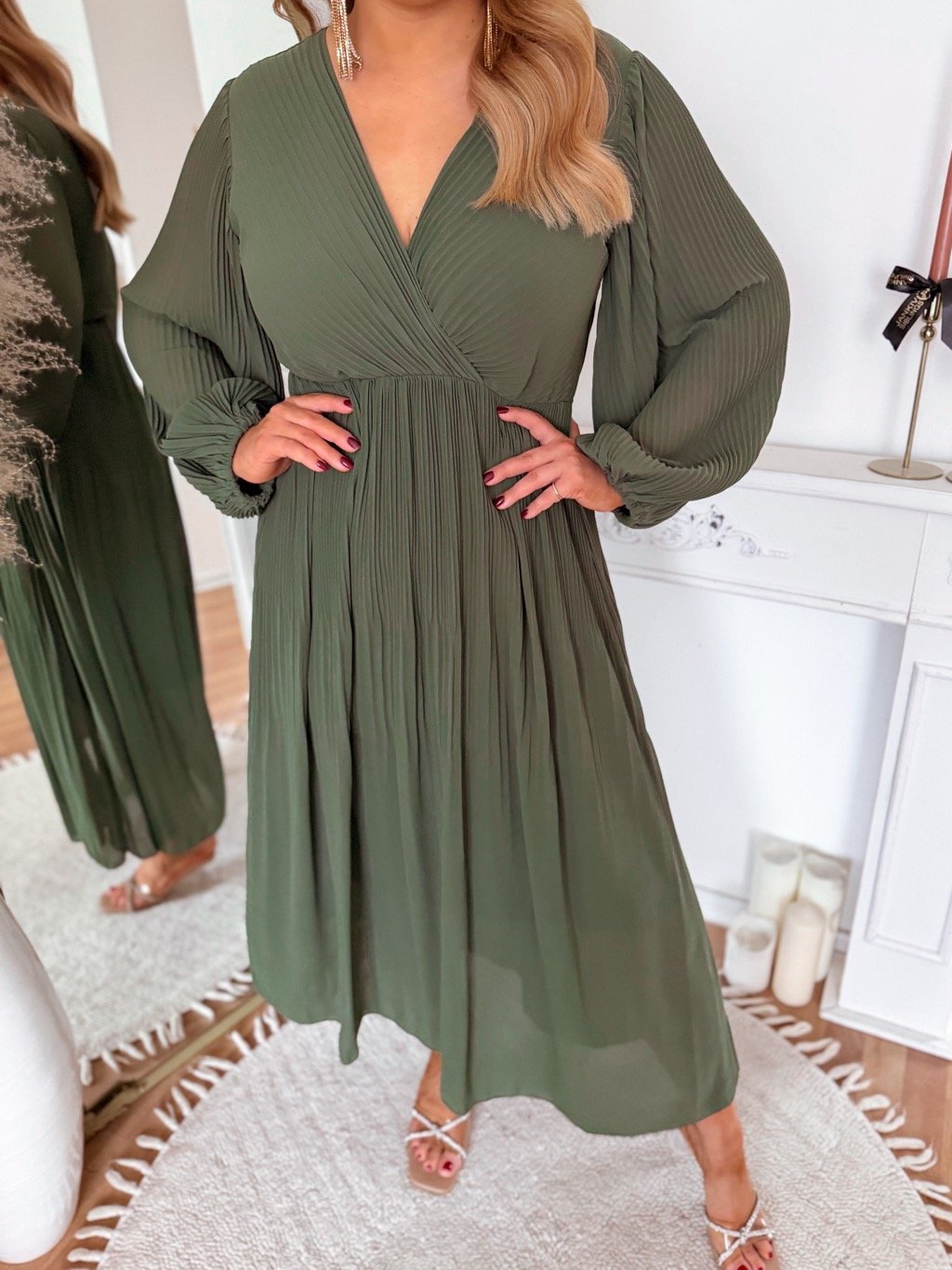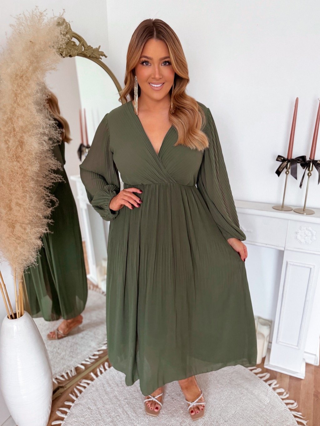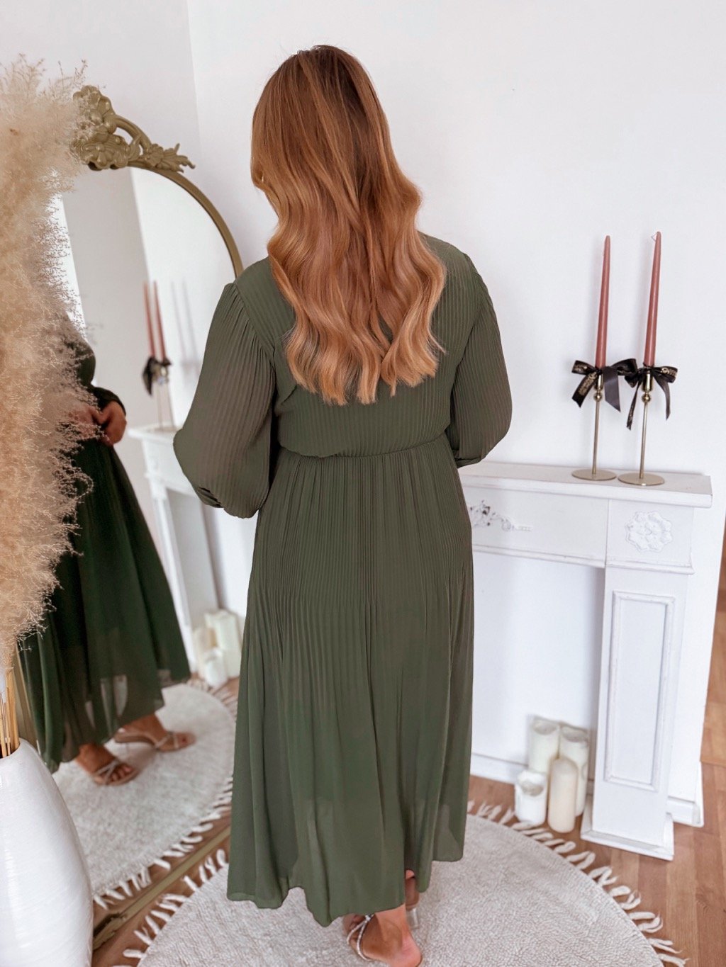 Dlouhé olivově zelené plisované šaty