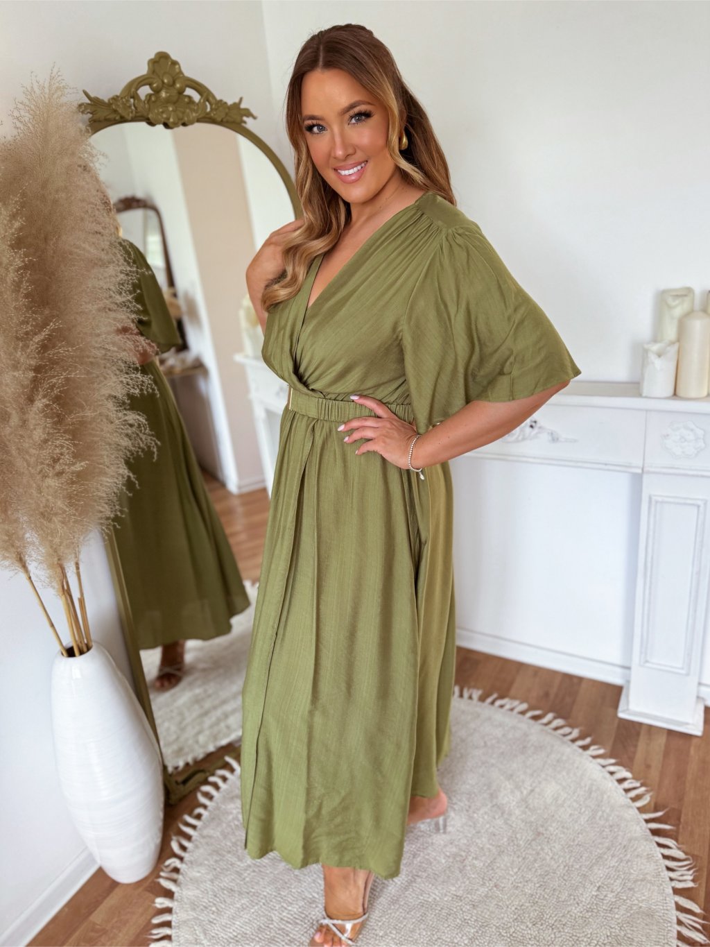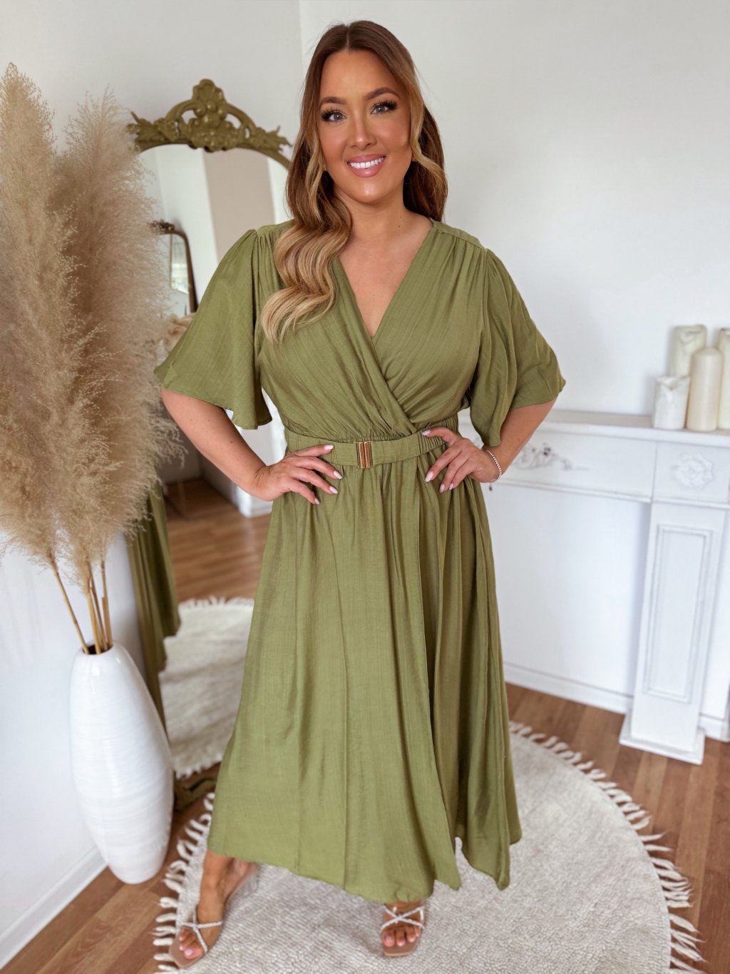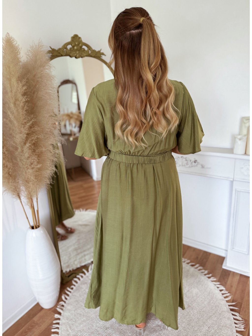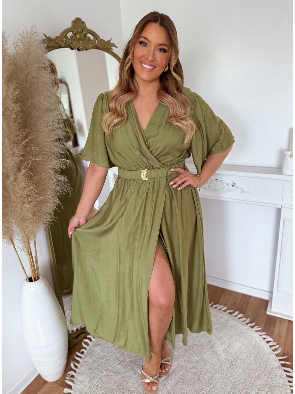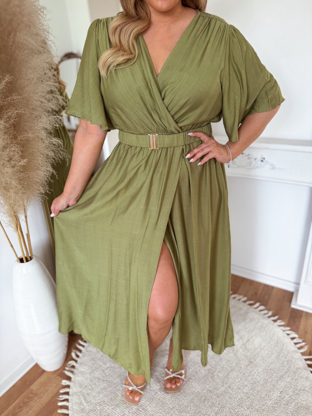 Dlouhé elegantní fuchsiové dámské šaty pro plnoštíhlé s krátkým rukávem a rozparkem. Šaty mají elastický pas a pásek. Modelka měří 168 cm a má na sobě velikost XL.