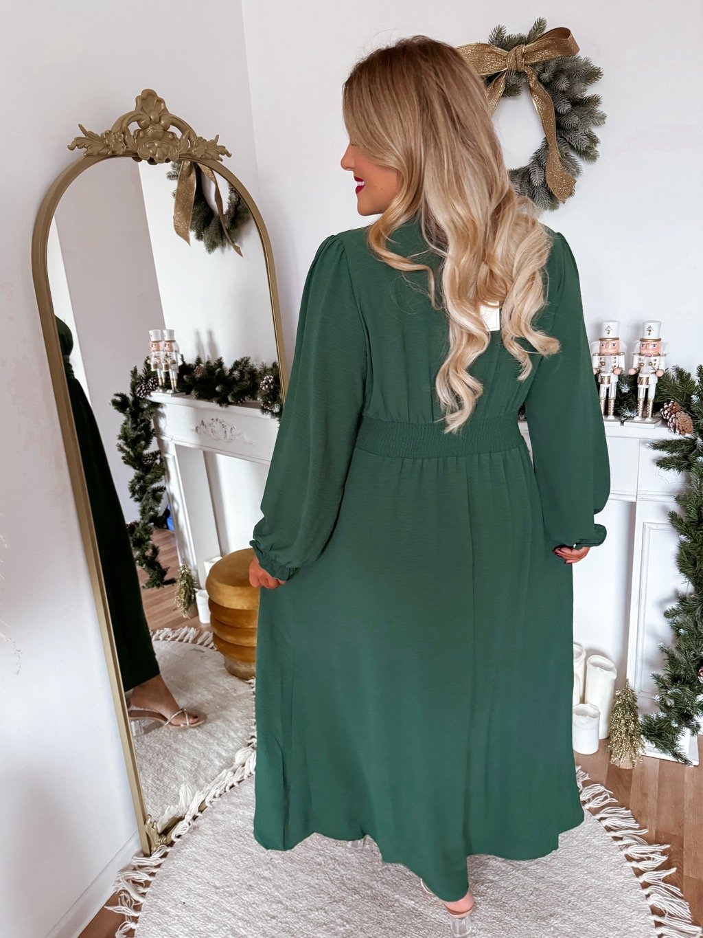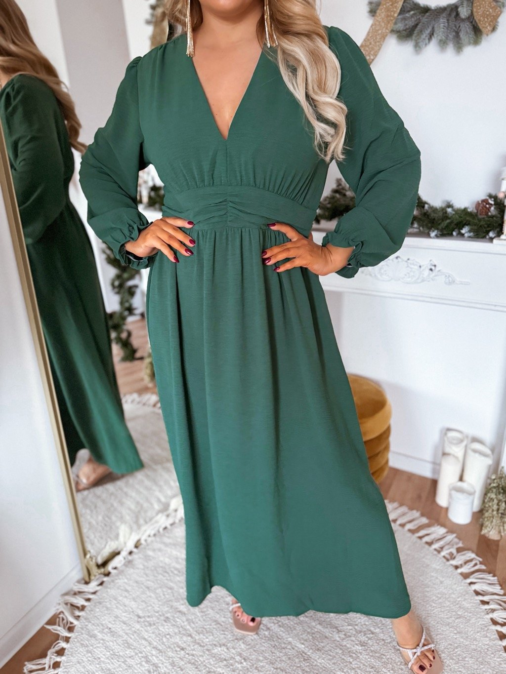 Dlouhé tmavě zelené společenské šaty pro plnoštíhlé s dlouhým rukávem a výstřihem, šaty mají gumičku v pase, která krásně tvaruje siluetu. Modelka měří 168 cm a má na sobě velikost XL.
