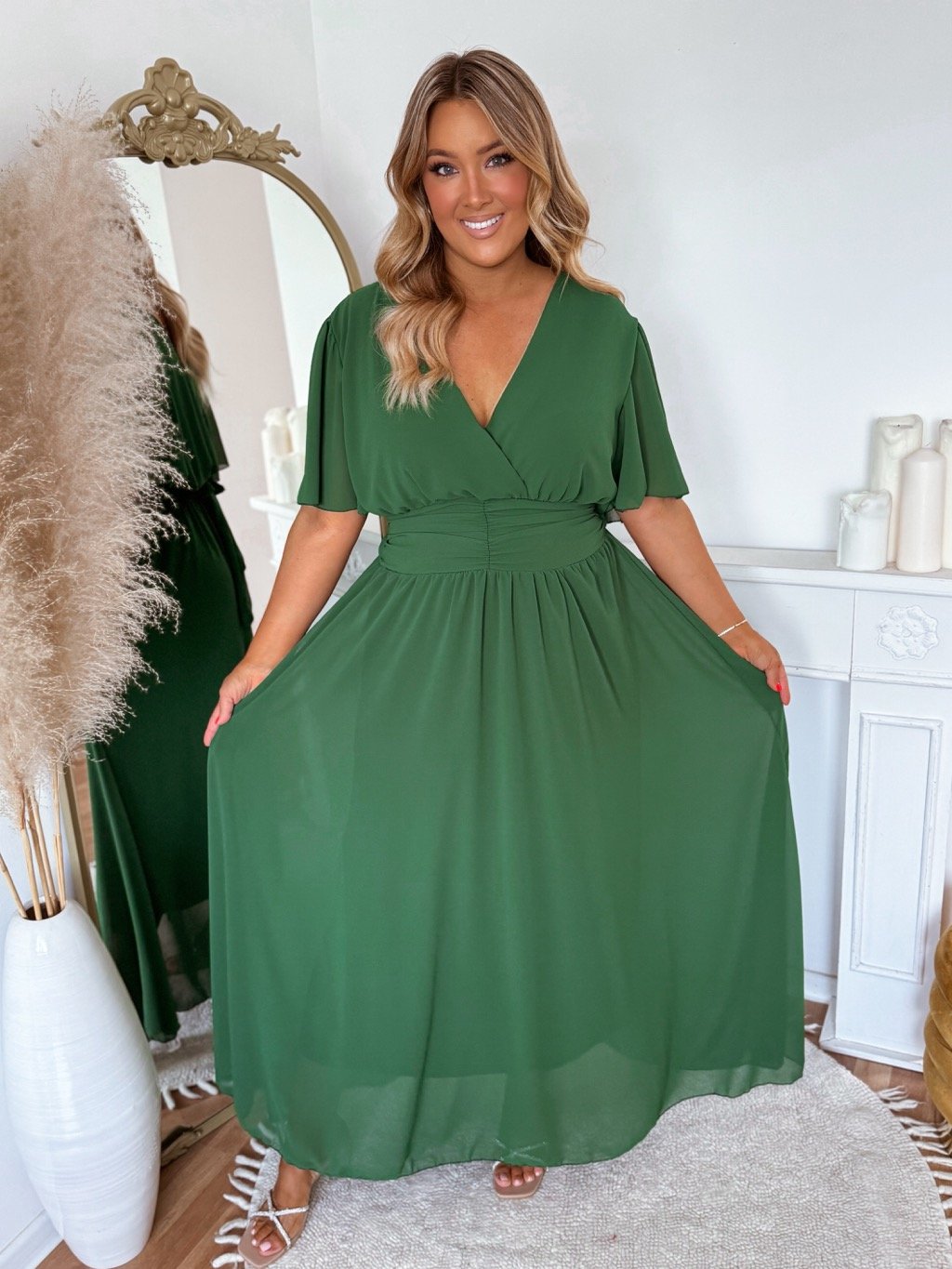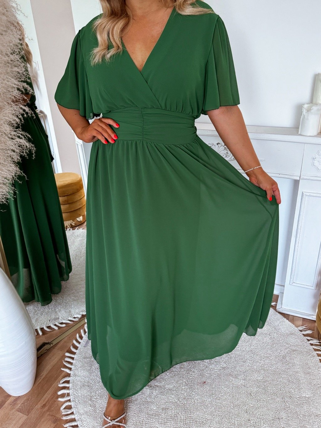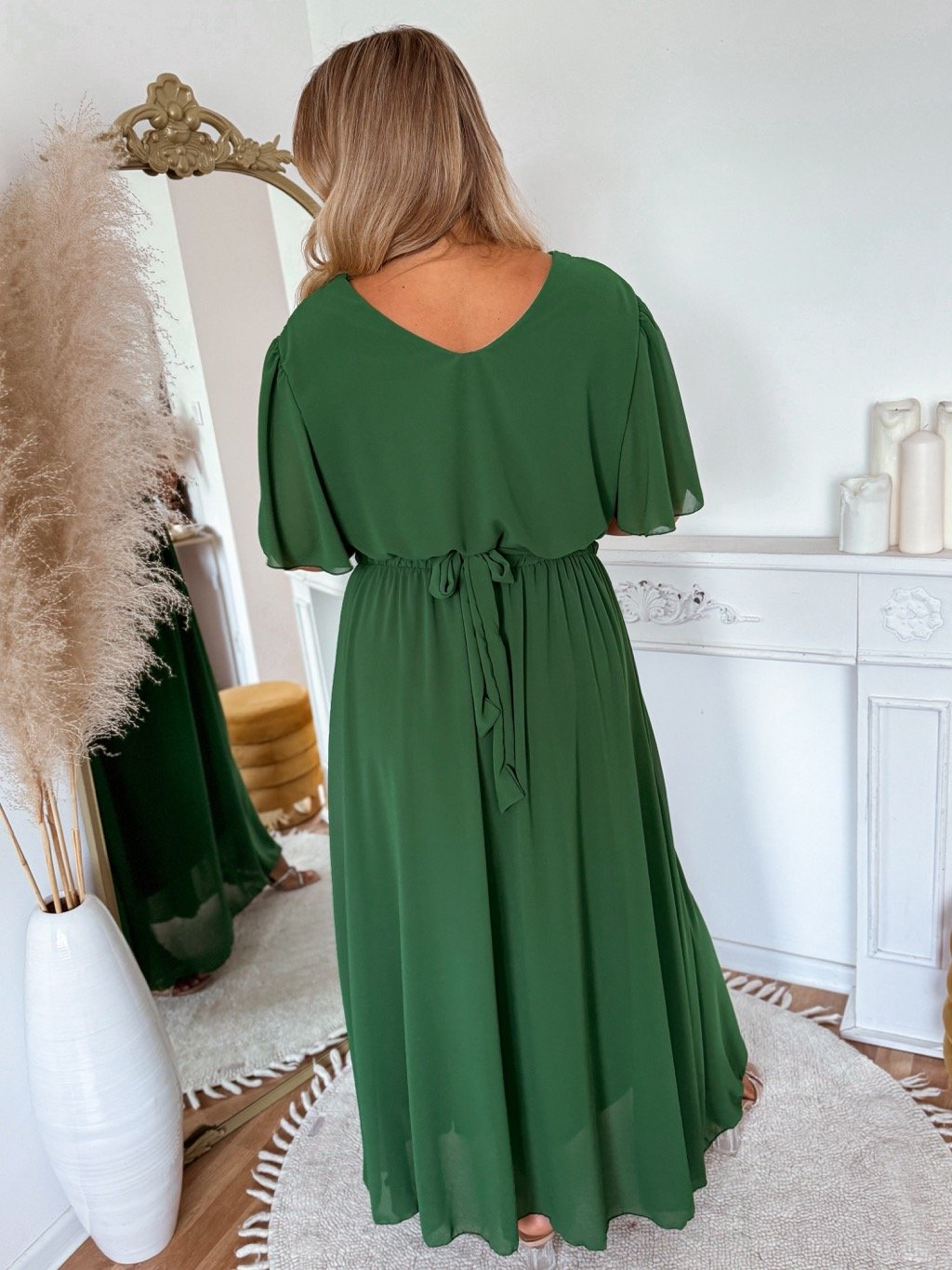 Dlouhé šaty pro plnoštíhlé s krátkým rukávem a s gumičkou v pase, stahují se opaskem na zádech, šaty mají zcela volný střih. Šaty jsou vhodné pro velikosti XL- 4XL. Modelka měří 168 cm a má na sobě univerzální velikost.
