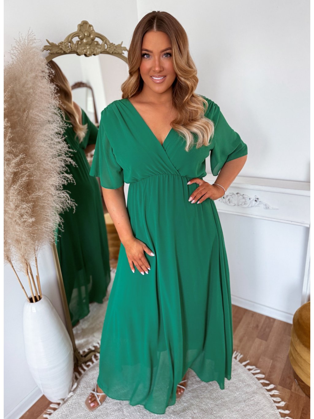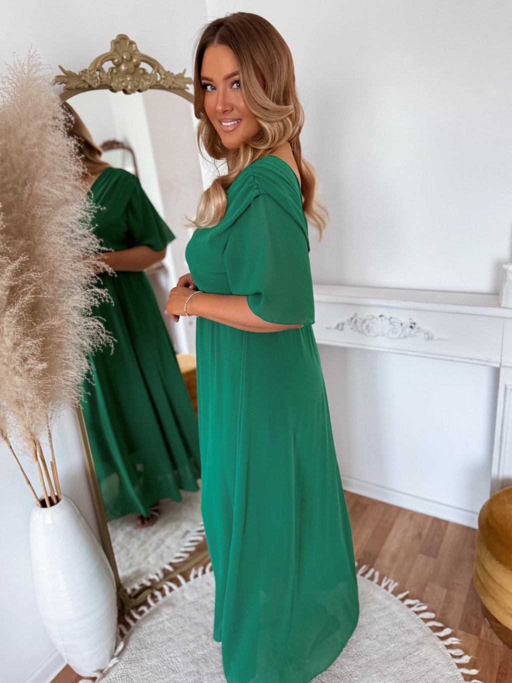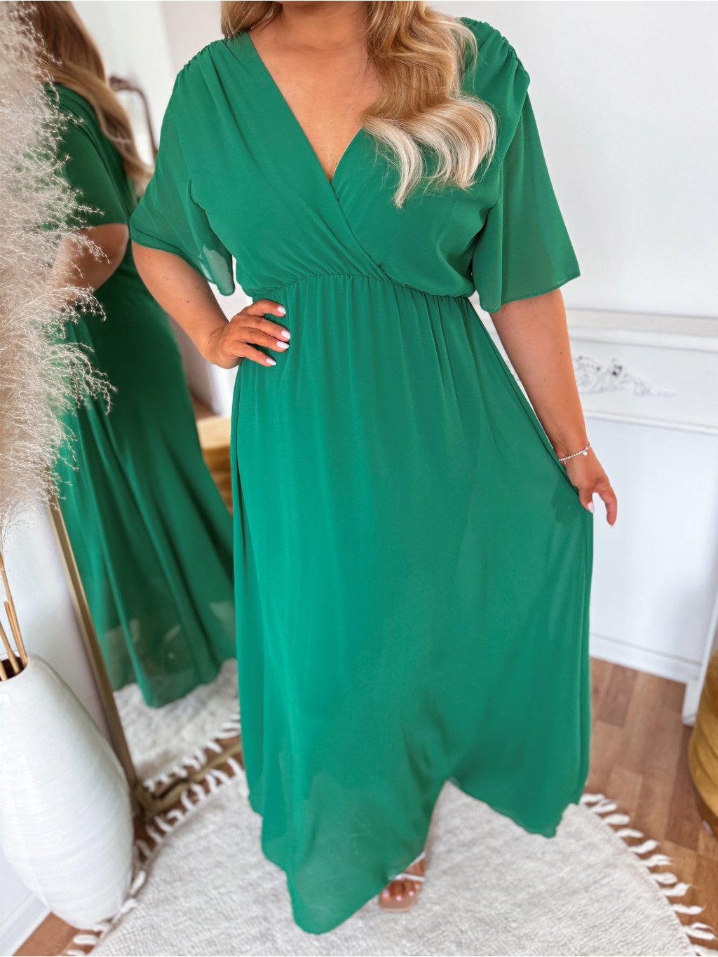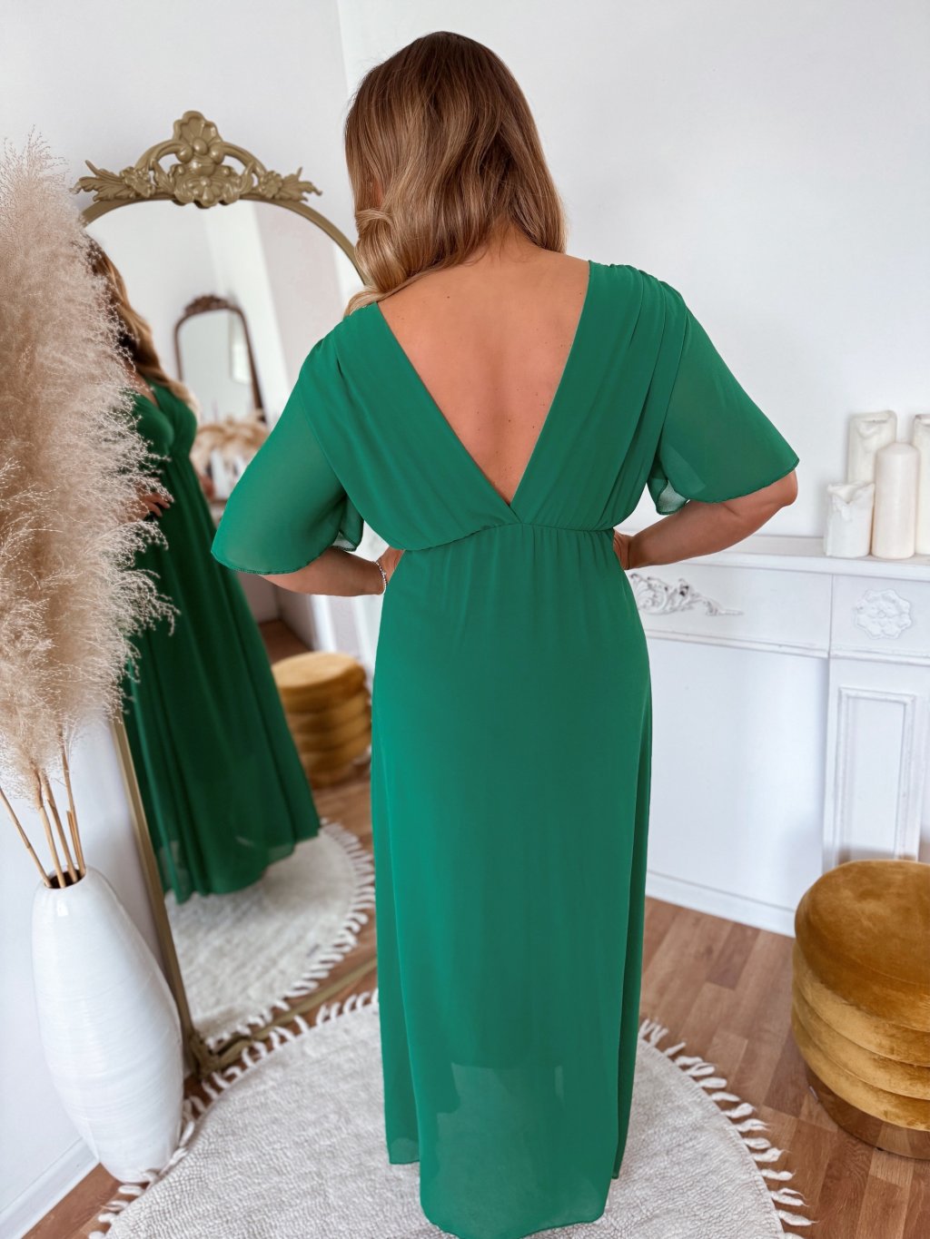 Dlouhé s výstřihem do V na přední části a na zádech. Šaty mají pod prsy elastickou gumičku, která se přizpůsobí postavě. Šaty jsou od pasu dolů volné. Modelka měří 168 cm a má na sobě velikost L/XL.