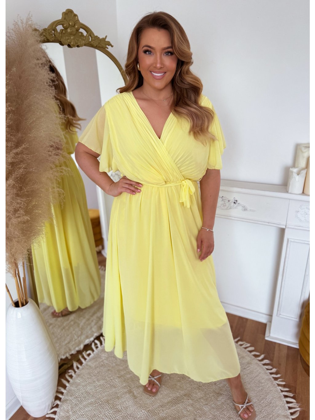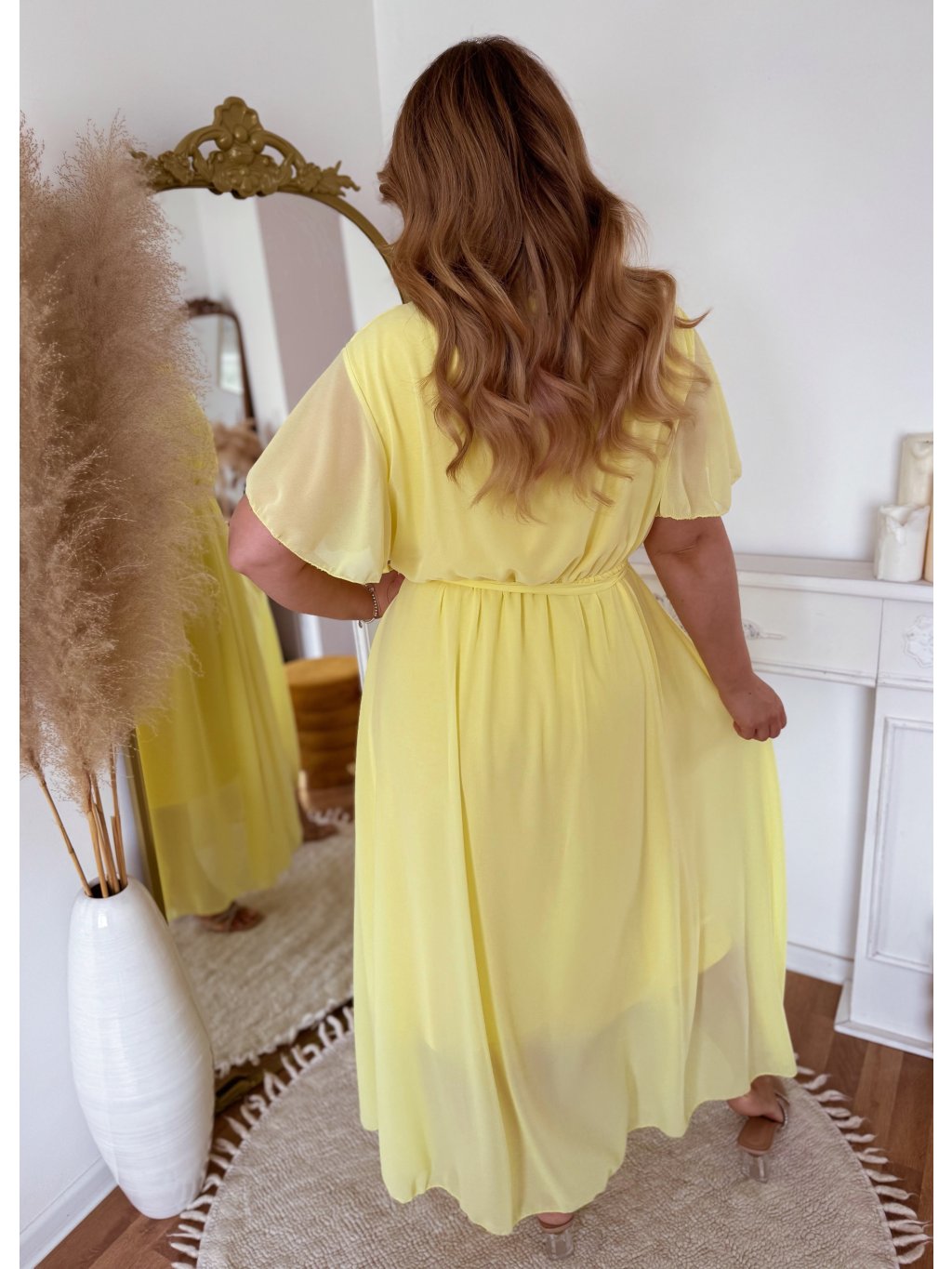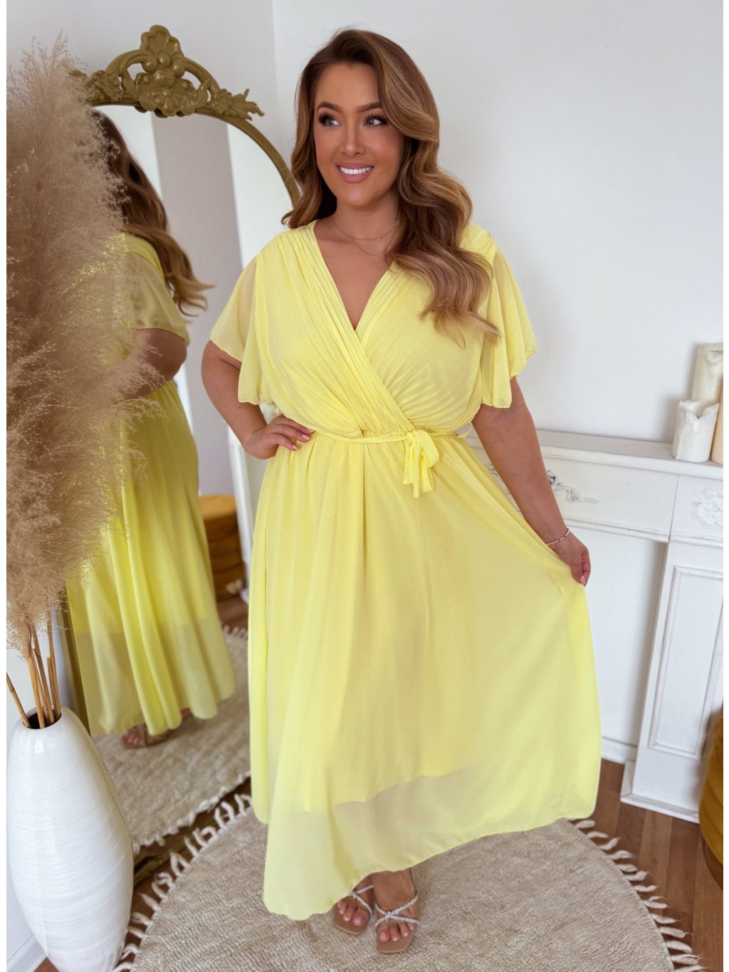 Elegantní dlouhé žluté šaty s krátkým rukávem a volnou sukní. Šaty mají volný střih a v pase jsou obšité gumičkou. Modelka měří 168 cm a má na sobě velikost XL/XXL.