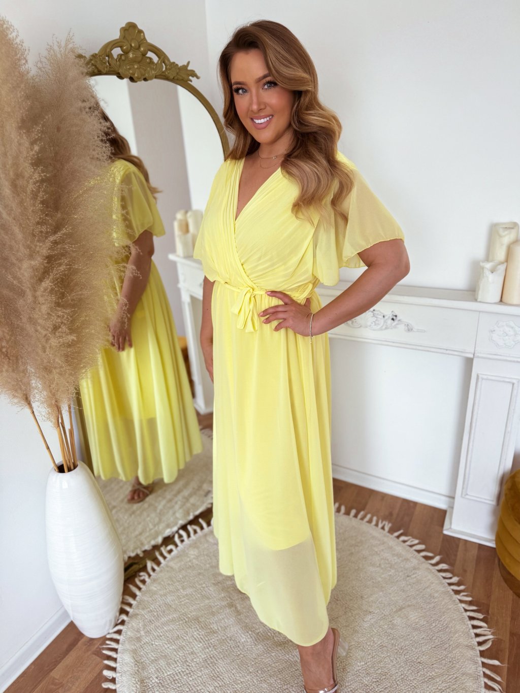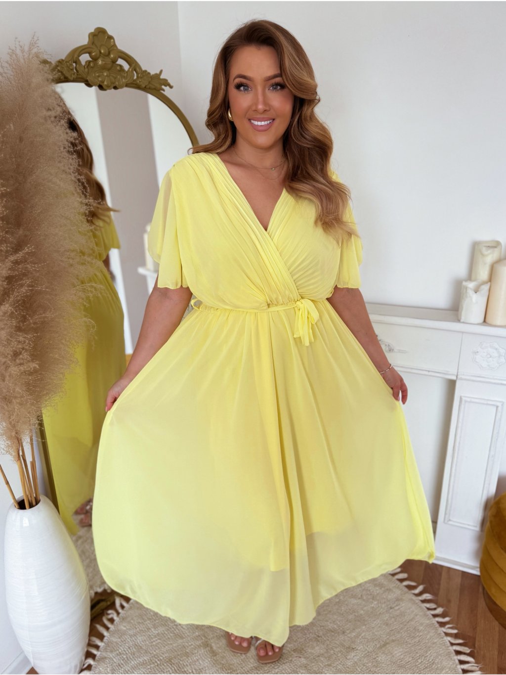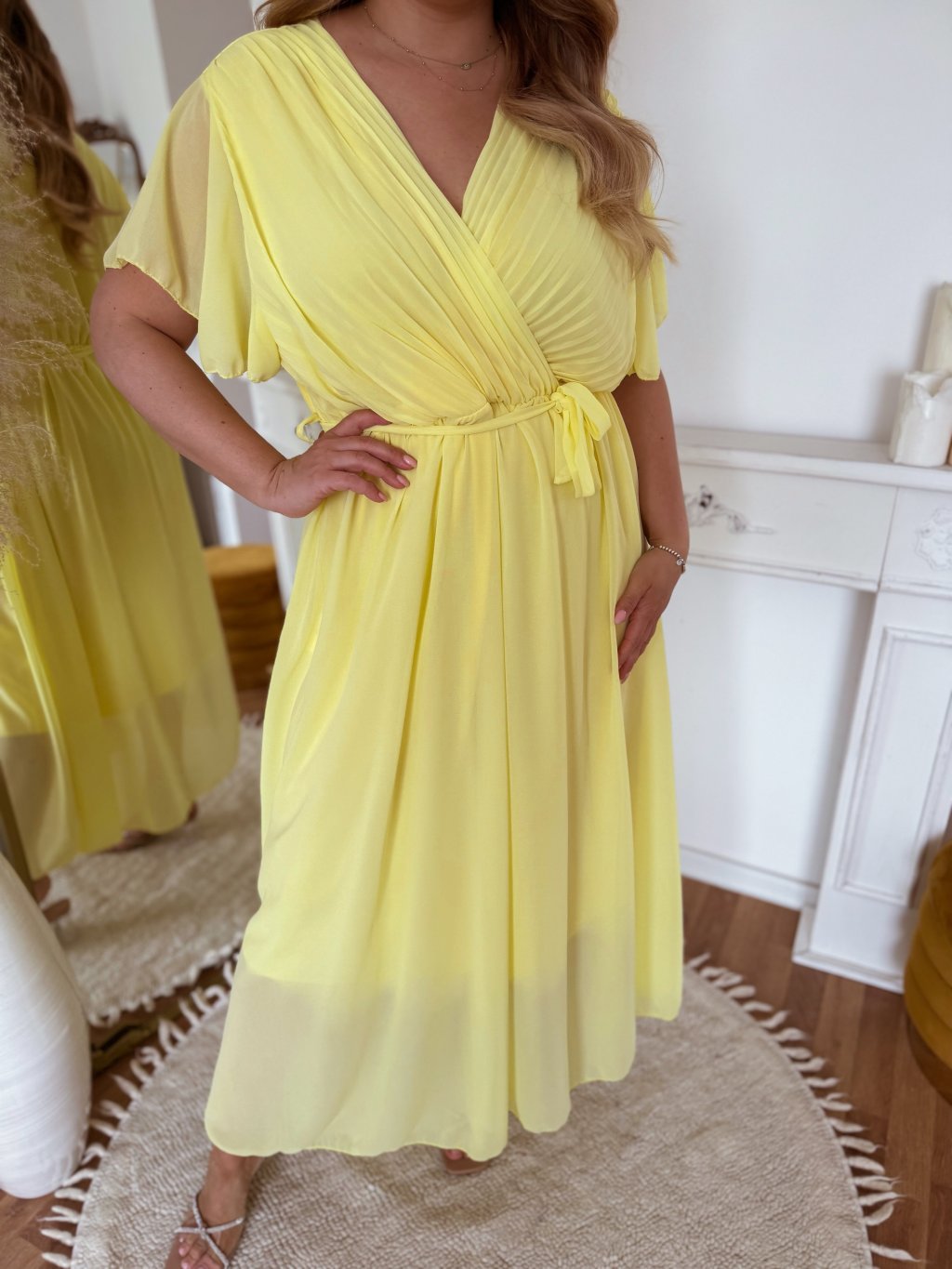 Elegantní dlouhé žluté šaty s krátkým rukávem a volnou sukní. Šaty mají volný střih a v pase jsou obšité gumičkou. Modelka měří 168 cm a má na sobě velikost XL/XXL.