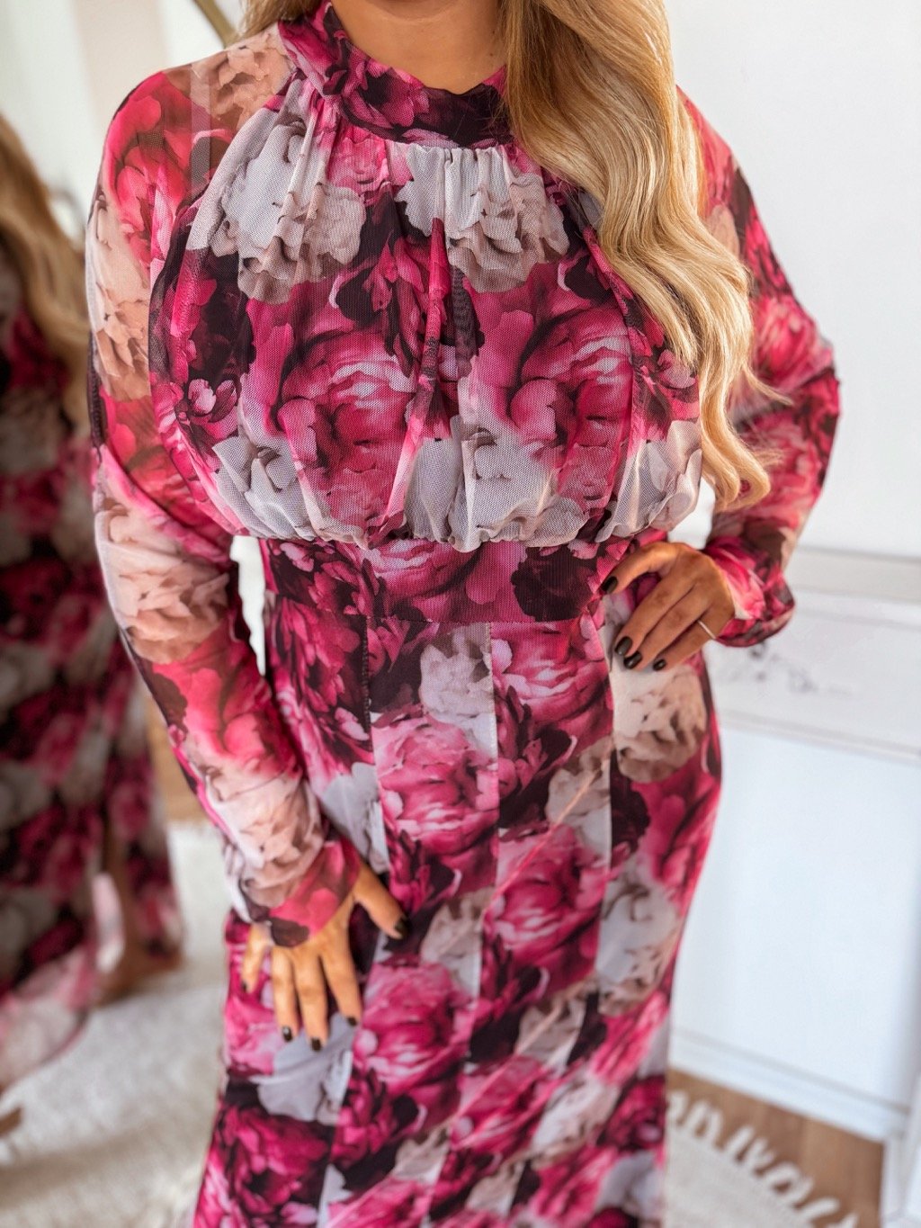 Dlouhé elegantní šaty s květinovým potiskem jsou vyrobeny z velmi pružné síťoviny. Šaty jsou na rukávech průhledné, na postavě jsou velmi pružné a napnuté. Šaty jsou vhodné pro velikosti XL- 4XL. Modelka měří 168 cm a má na sobě univerzální velikost.
