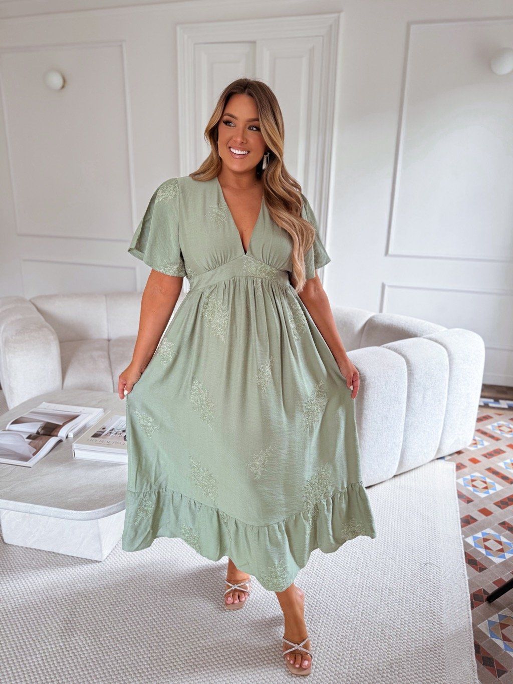 Dlouhé viskózové zelené šaty s výšivkou. Šaty mají volnější střih a elastický pásek na zádech. Sukně šatů je zcela volná. Modelka měří 168 cm a má na sobě velikost XL.
