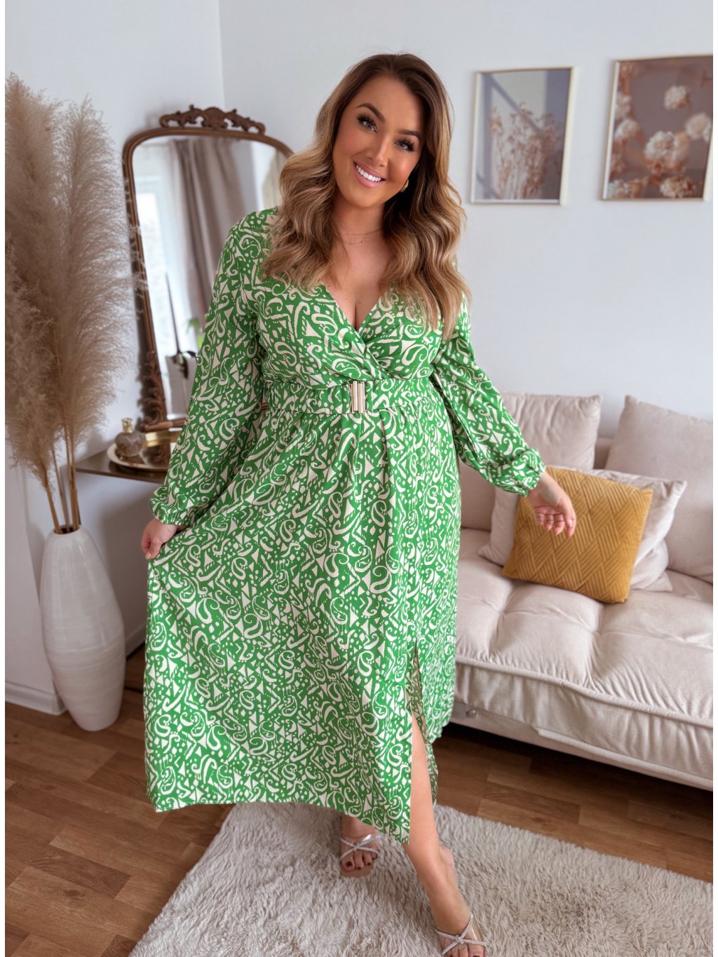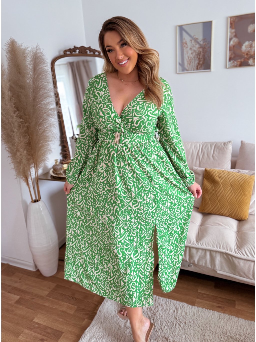 Dlouhé dámské šaty s pružným pasem a výstřihem do V. Šaty jsou dodávány s páskem, šaty mají dole rozparek, sukně je zcela volná. Modelka měří 168 cm a má na sobě velikost XL/XXL.