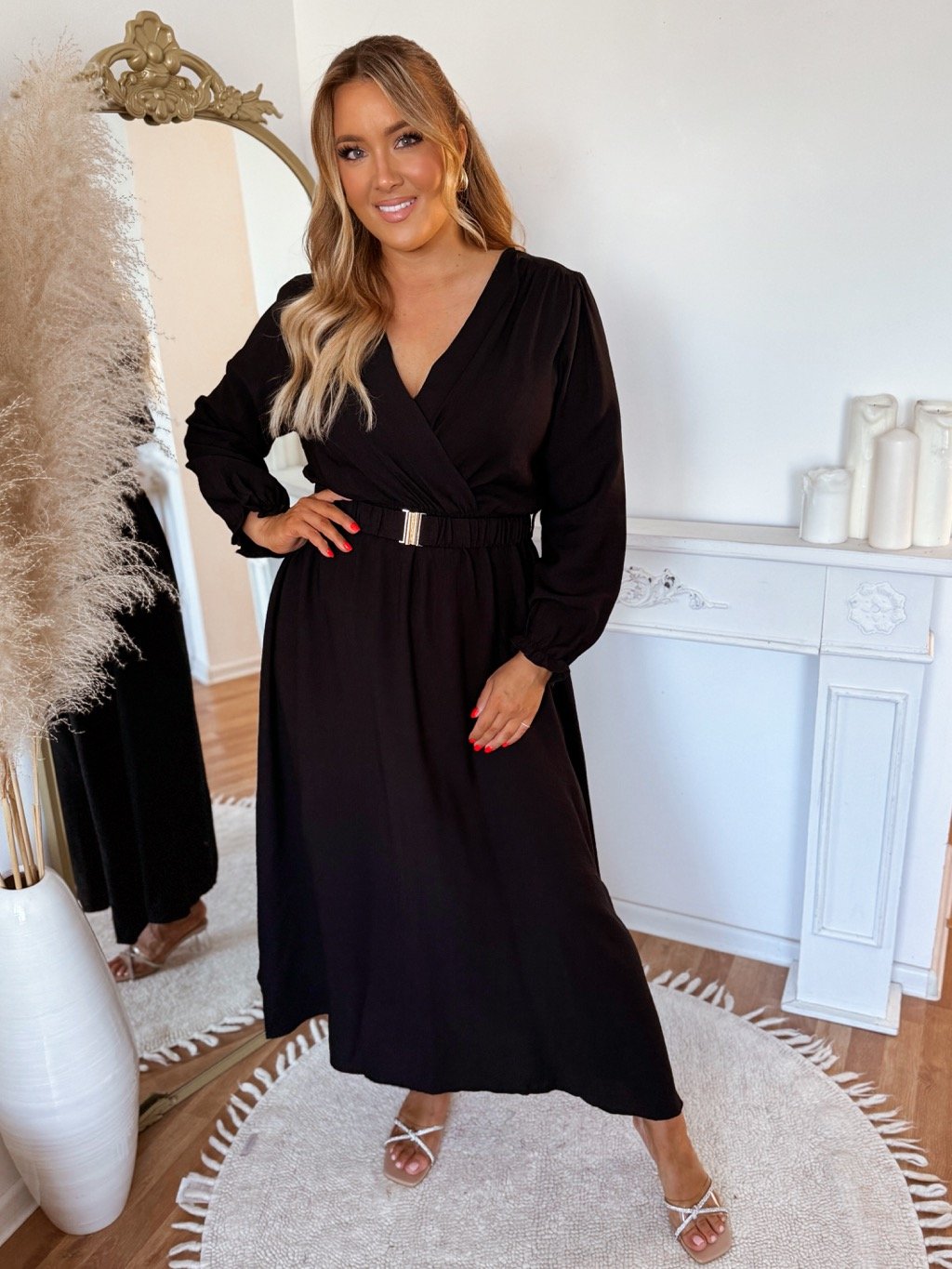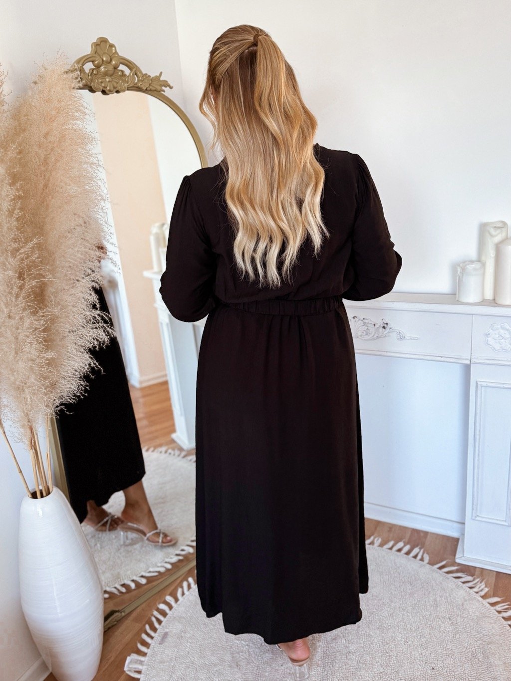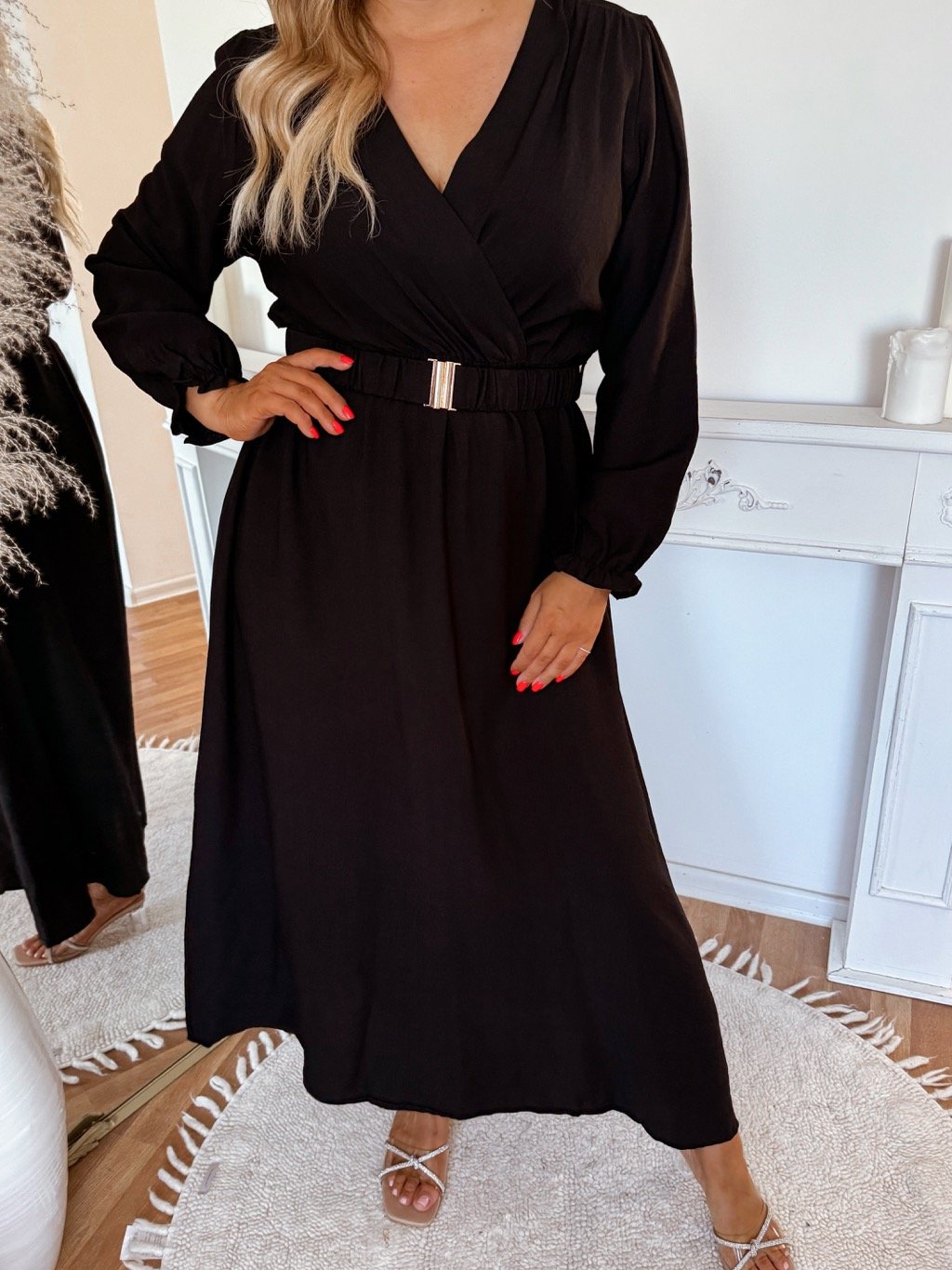 Tyto elegantní dlouhé šaty pro plnoštíhlé mají pohodlný volnější střih, dlouhé rukávy se stahováním na gumičku a ozdobný pásek, který zvýrazní pas. V pase je všitá guma. Výstřih do „V“ opticky prodlužuje krk a působí velmi žensky. Modelka měří 168 cm a má na sobě velikost XL.