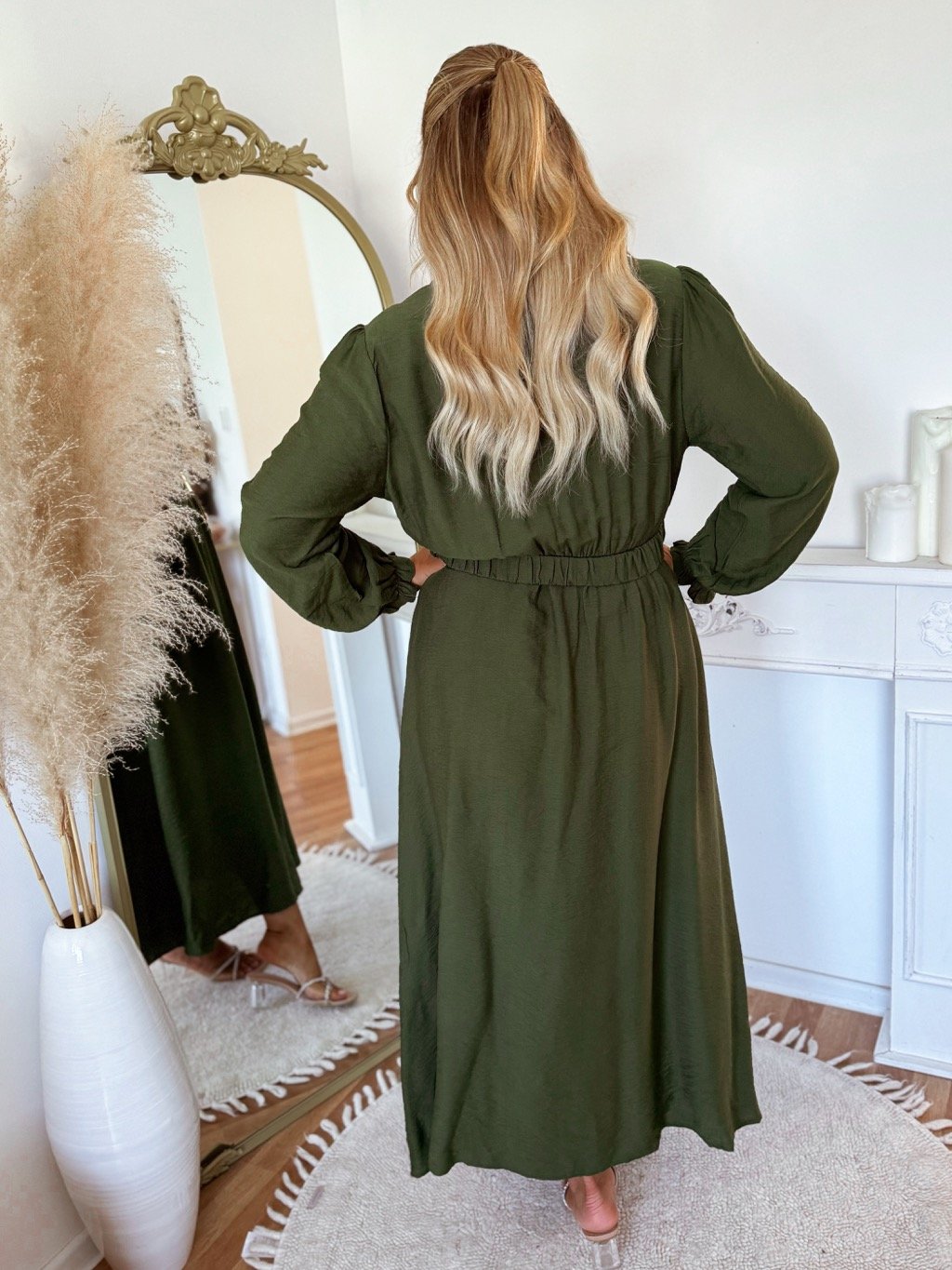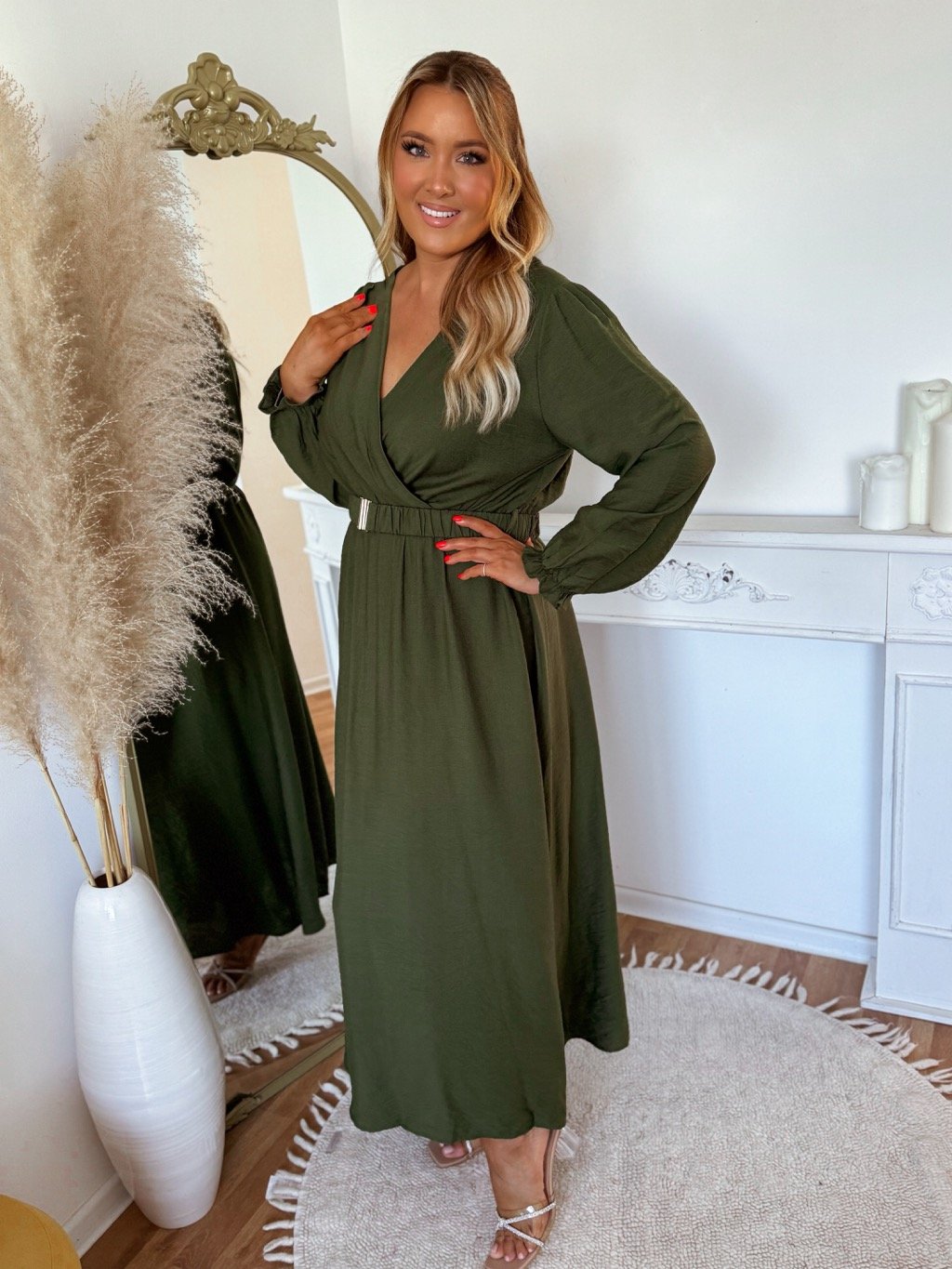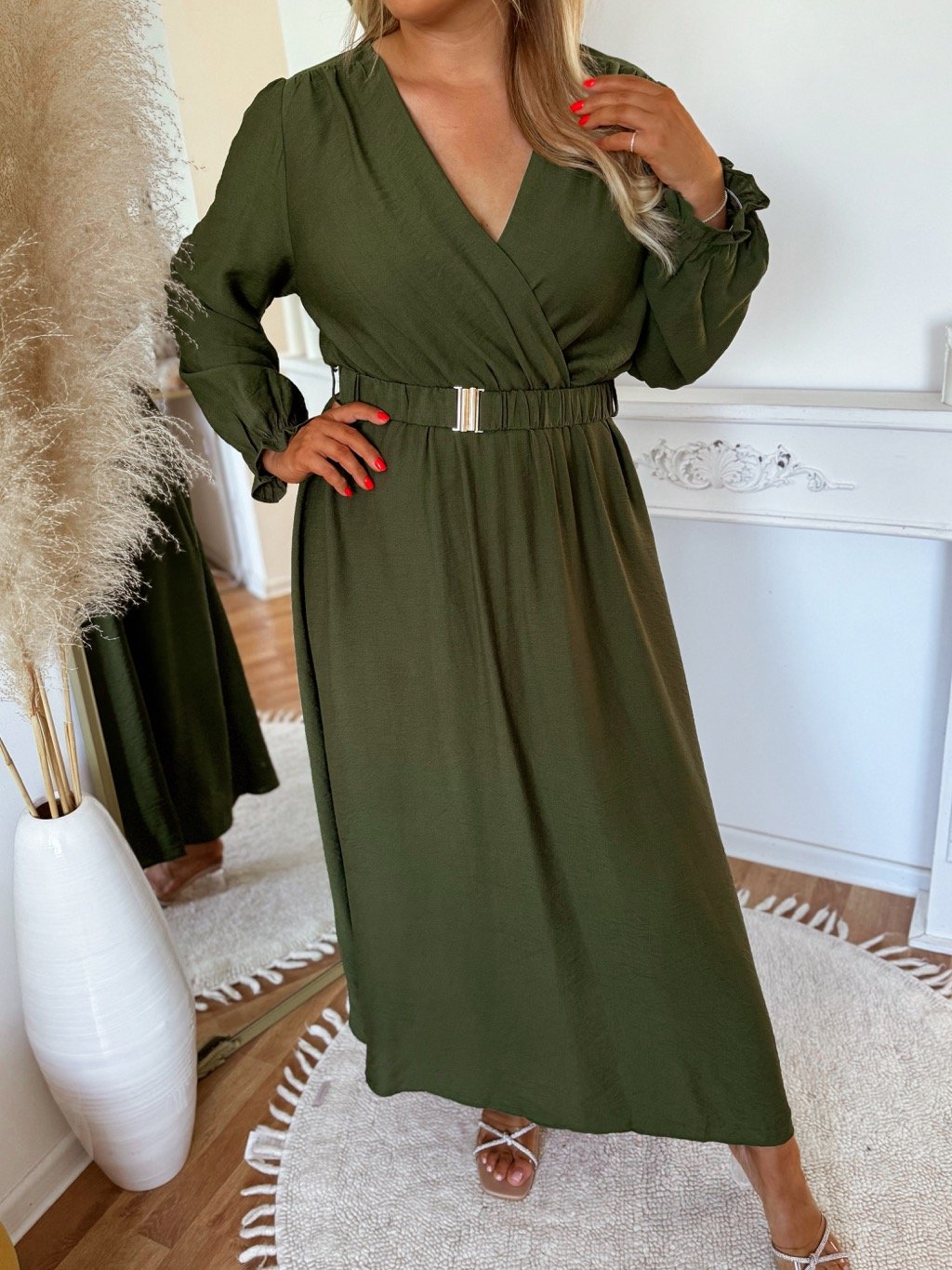 Tyto elegantní dlouhé šaty pro plnoštíhlé mají pohodlný volnější střih, dlouhé rukávy se stahováním na gumičku a ozdobný pásek, který zvýrazní pas. V pase je všitá guma. Výstřih do „V“ opticky prodlužuje krk a působí velmi žensky. Modelka měří 168 cm a má na sobě velikost XL.