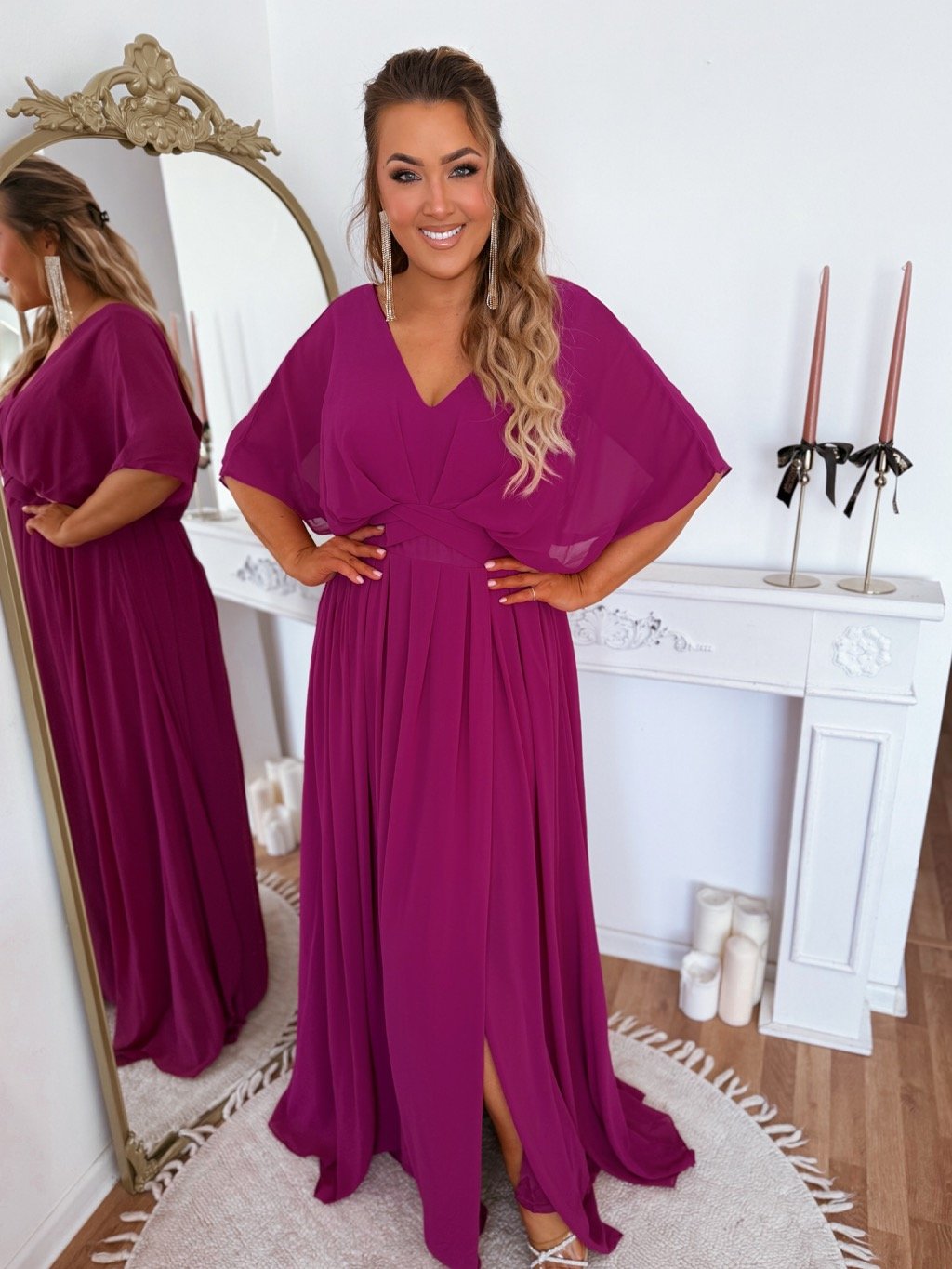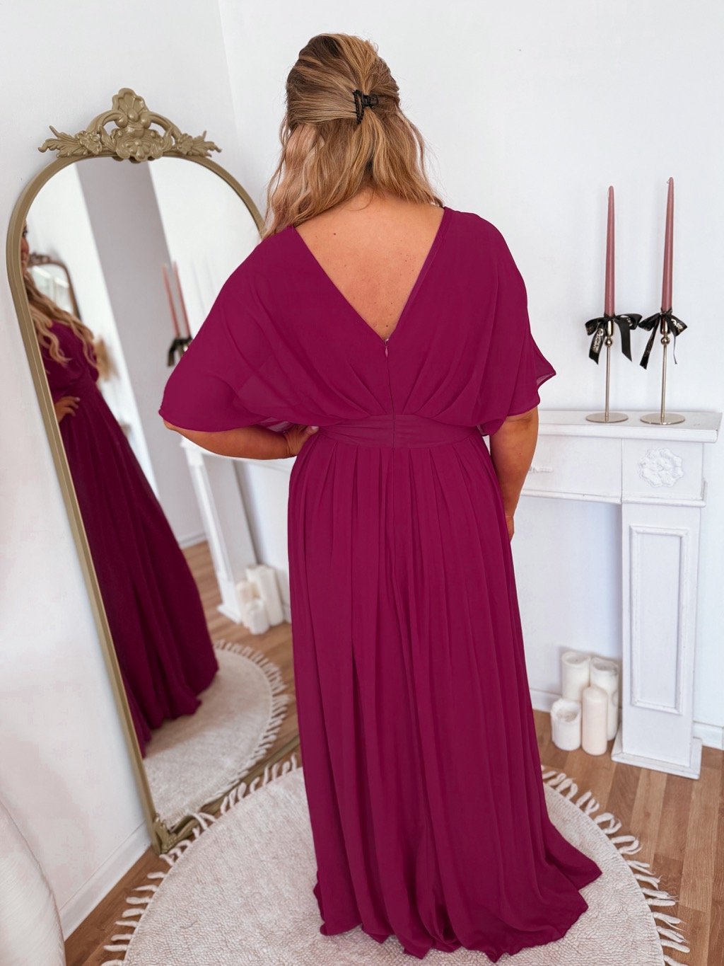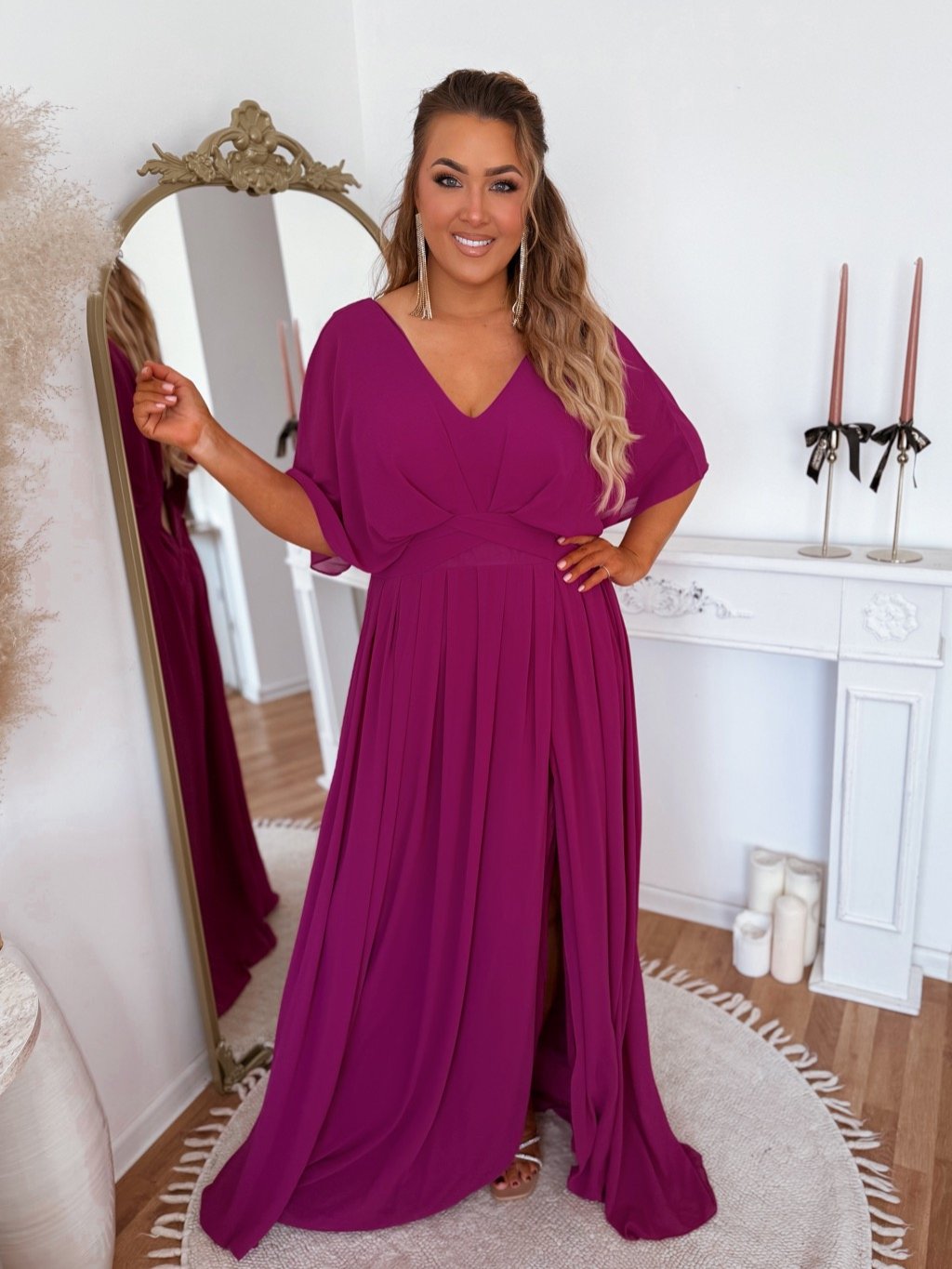 Společenské šaty pro plnoštíhlé s krátkým rukávem, šaty mají zcela volný střih a jsou zúžené v pase. Šaty mají na zádech zip. Modelka měří 168 cm a má na sobě velikost XXL.