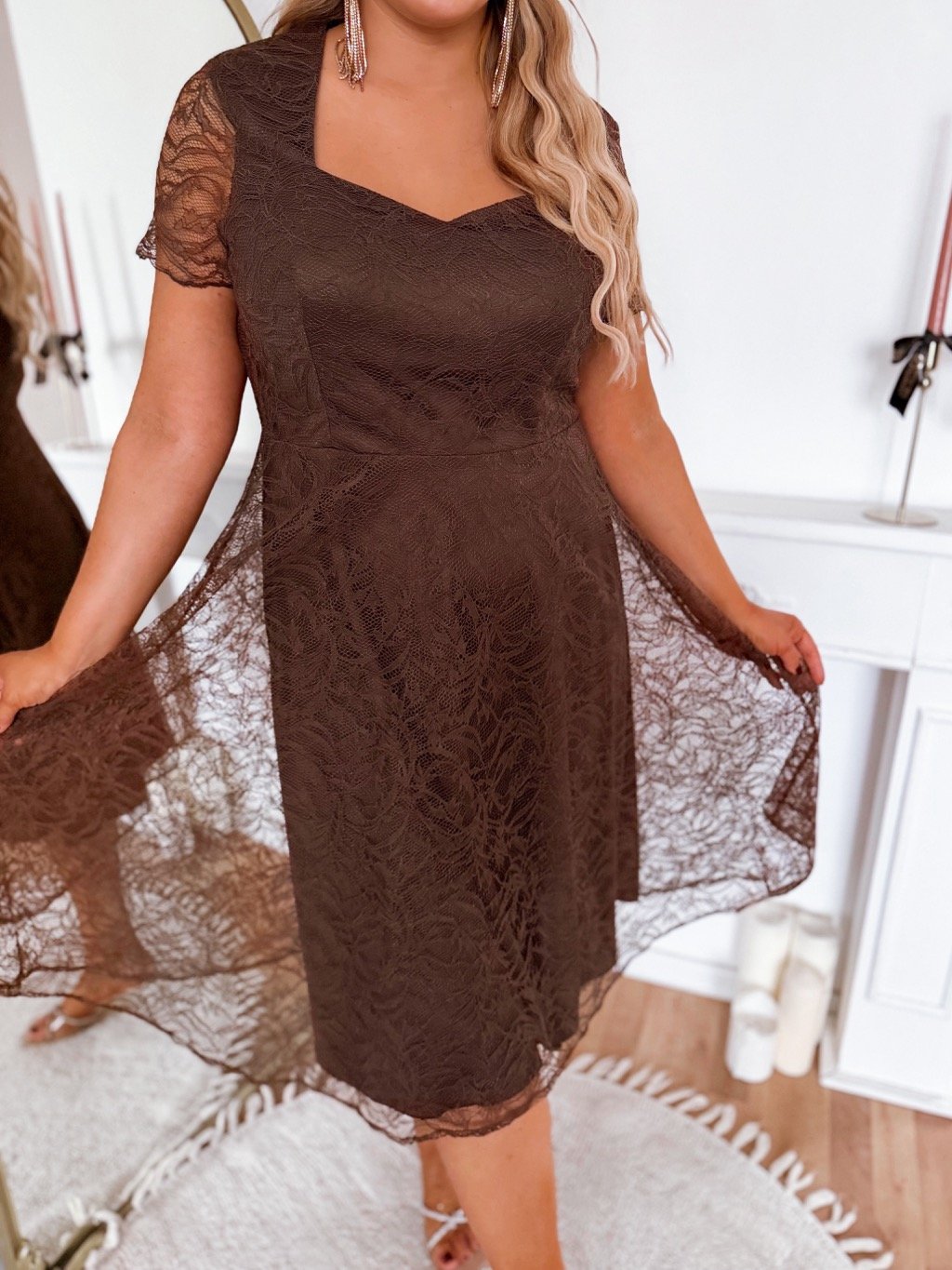 Hnědé midi krajkové šaty