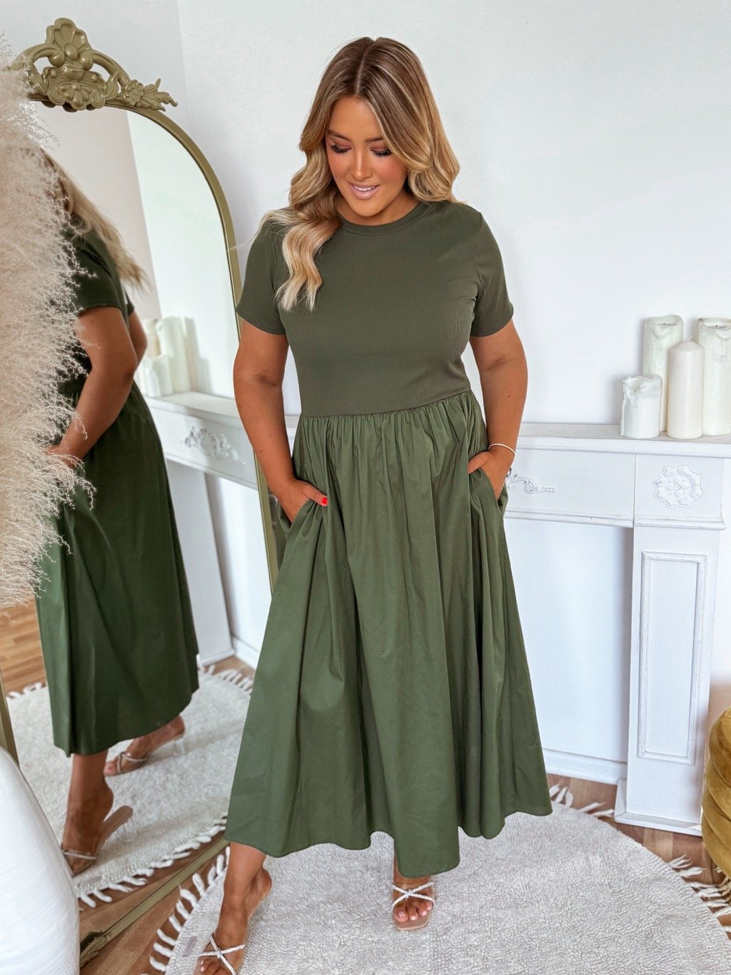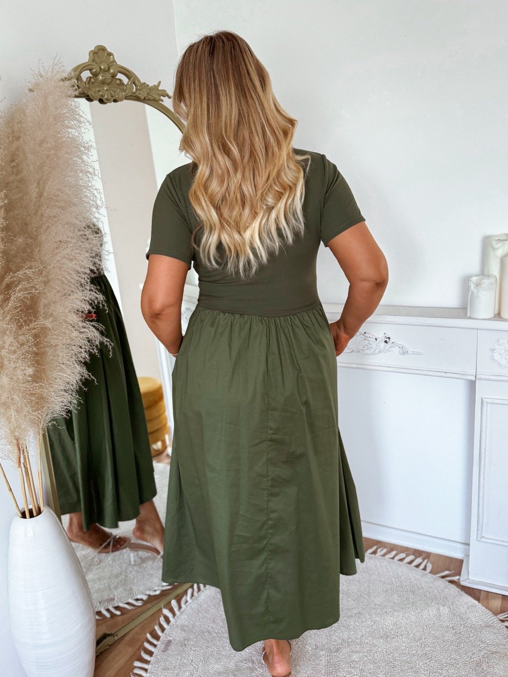 Dámské šaty s krátkým rukávem mají elastický žebrovaný top a zcela volnou bavlněnou sukni s kapsami. Šaty sedí na velikosti XL-3XL. Modelka měří 168 cm a má na sobě univerzální velikost.