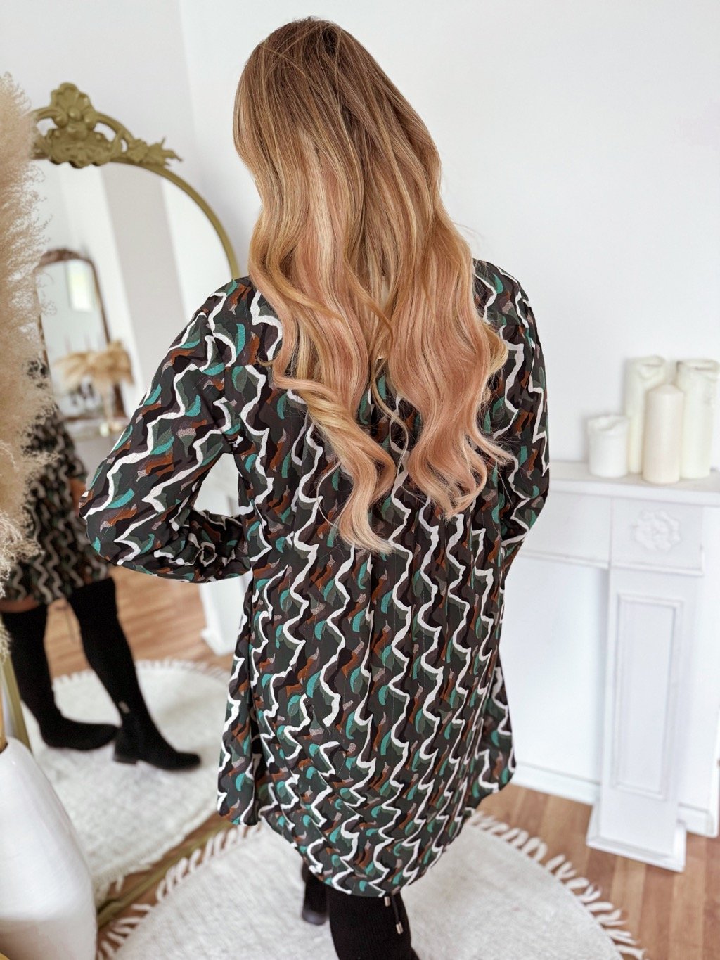 Krátké košilové šaty pro plnoštíhlé s dlouhým rukávem mají zcela volný střih. Modelka měří 168 cm a má na sobě velikost XL.