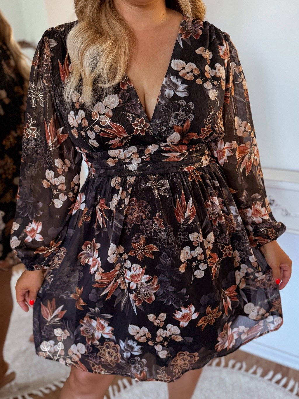 Krátké černé šaty pro plnoštíhlé se vzorem květin mají gumičku v pase, boky mají volný střih. Modelka měří 168 cm a má na sobě velikost XL.