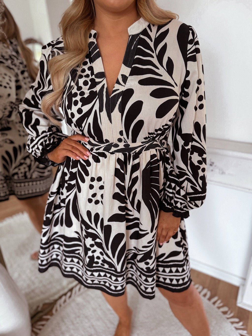 Krátké černo-bílé šaty pro plnoštíhlé s dlouhým rukávem mají gumičku v pase. Modelka měří 168 cm a má na sobě velikost XL.