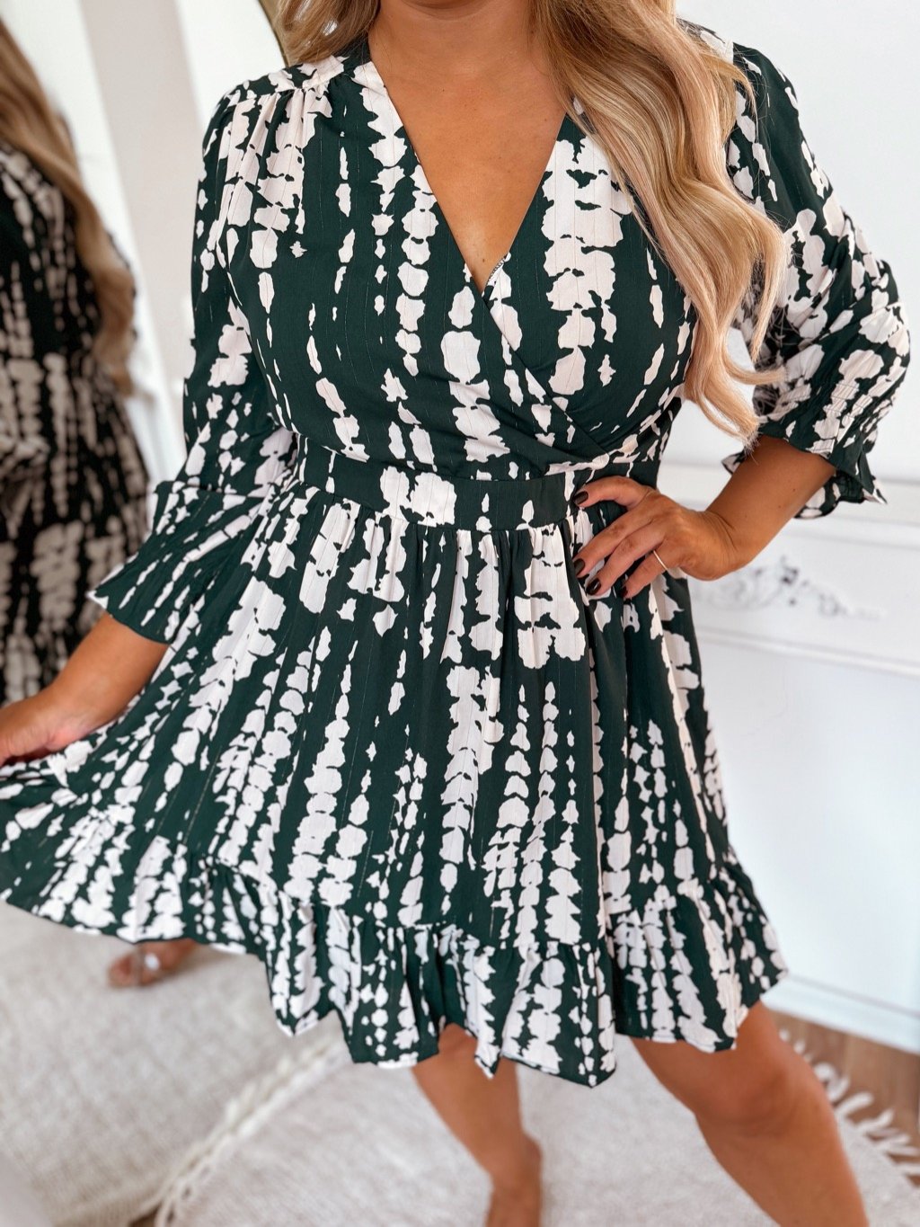 Krátké šaty s dlouhými rukávy mají v pase gumičku. Modelka měří 168 cm a má na sobě velikost XL.