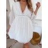 Krátké letní šaty v bílé barvě mají volný splývavý střih. Šaty jsou podšité spodničkou, rukávy šatů jsou průhledné. Modelka měří 168 cm a má na sobě velikost XL.