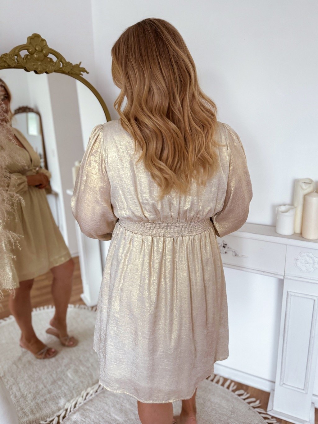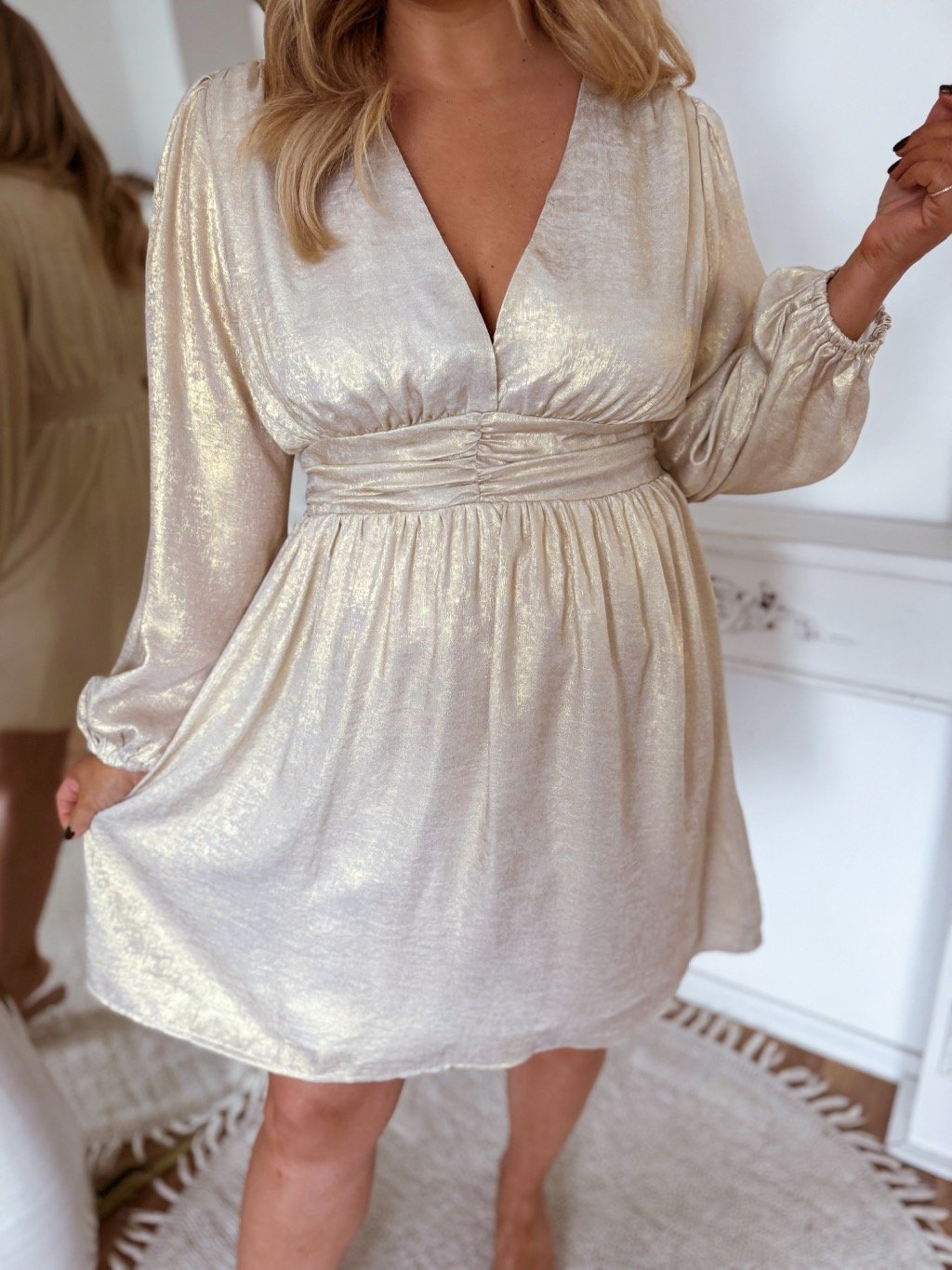 Krátké zlaté šaty pro plnoštíhlé mají gumičku v pase, boky mají volný střih. Modelka měří 168 cm a má na sobě velikost XL.