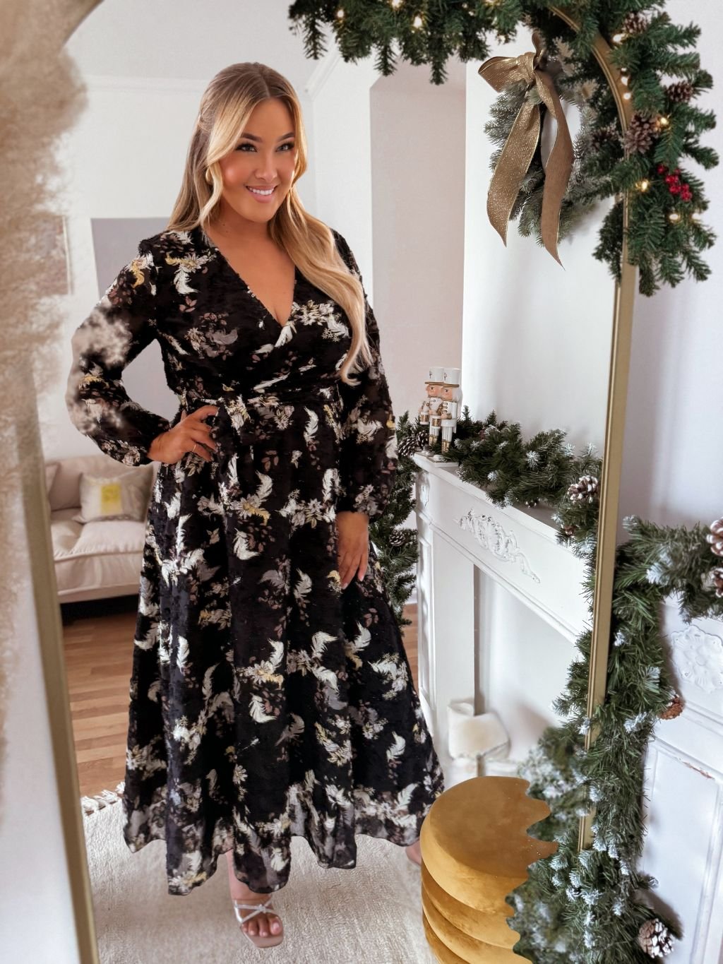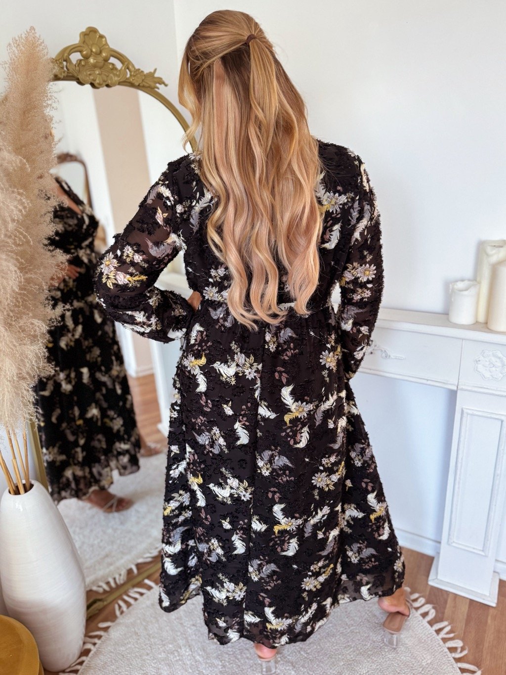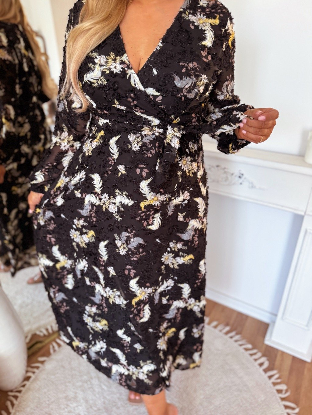 Dlouhé dámské šaty se vzorem květin a peří. Mají užší střih na hrudi a elastický pas. Od pasu dolů jsou šaty zcela volné. Rukávy jsou průhledné. Modelka měří 168 cm a má na sobě velikost XL/XXL.