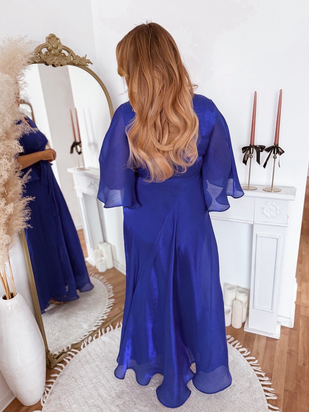 Modré společenské šaty s volánovými rukávy