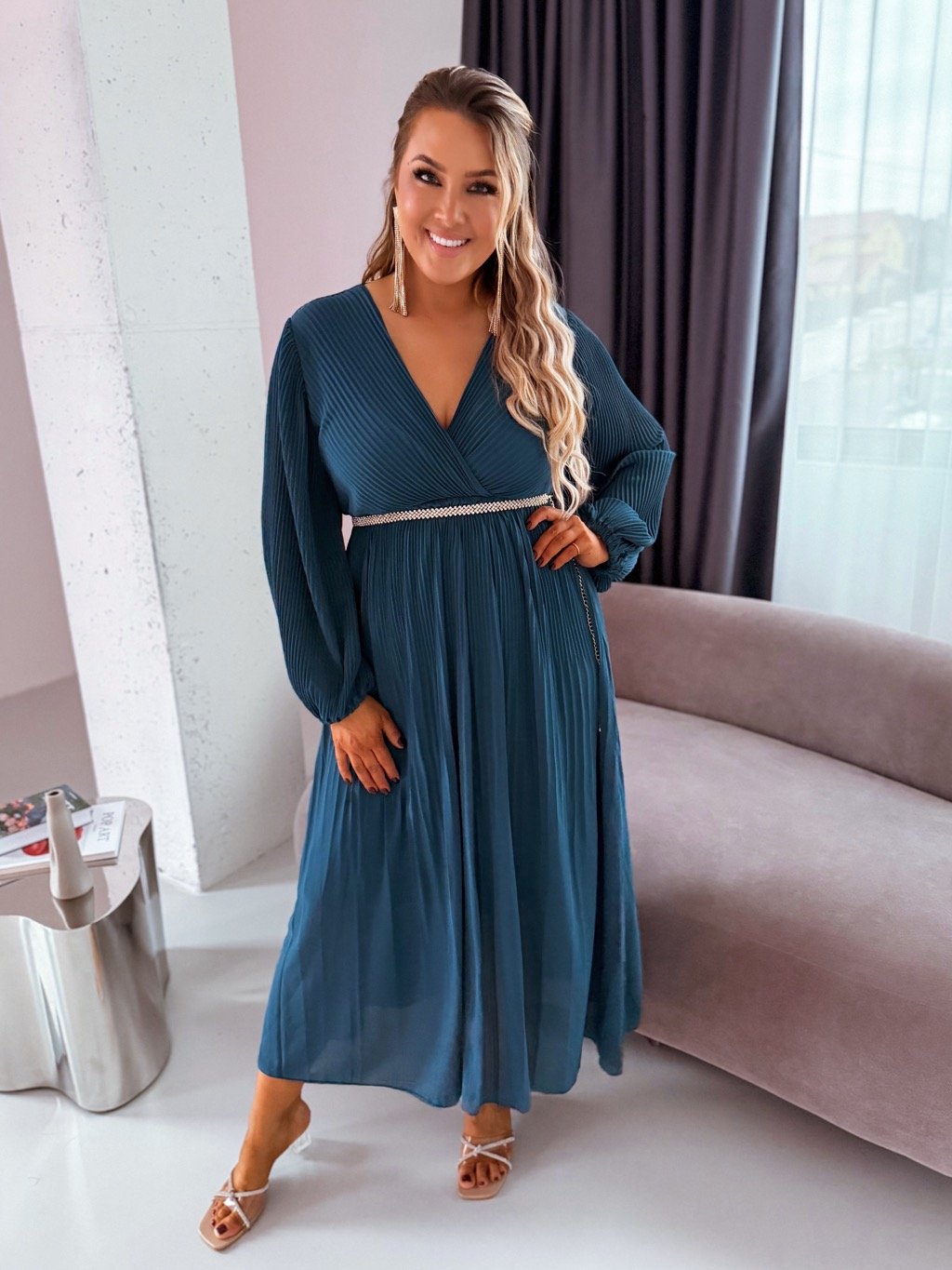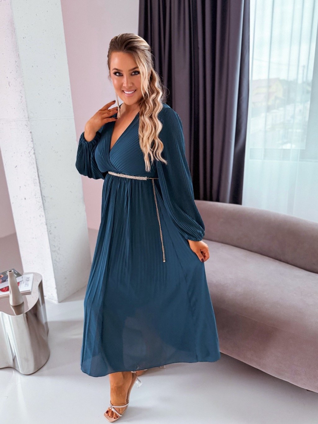 Elegantní plisované šaty s dlouhými rukávy mají volnější střih a pružný pásek v pase. Třpytivý pásek není součástí šatů, najdete ho mezi doplňky. Šaty jsou na bocích zcela volné. Modelka měří 168 cm a má na sobě velikost L/XL.
