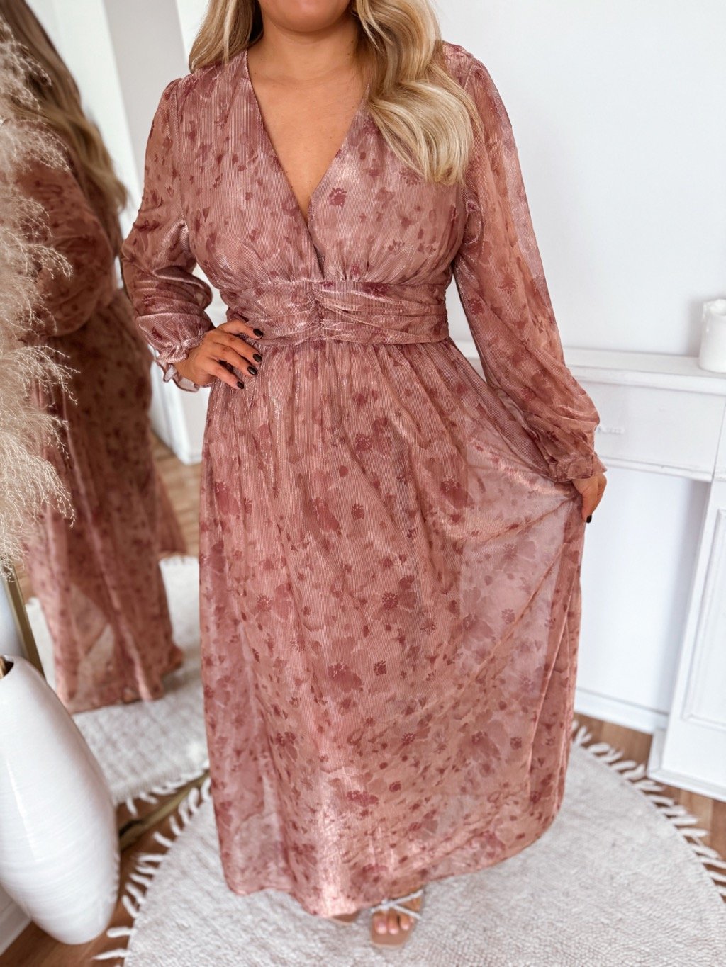 Elegantní šaty s dlouhým rukávem mají elastickou gumičku v pase a volnou sukni. Modelka měří 168 cm a má na sobě velikost XL.