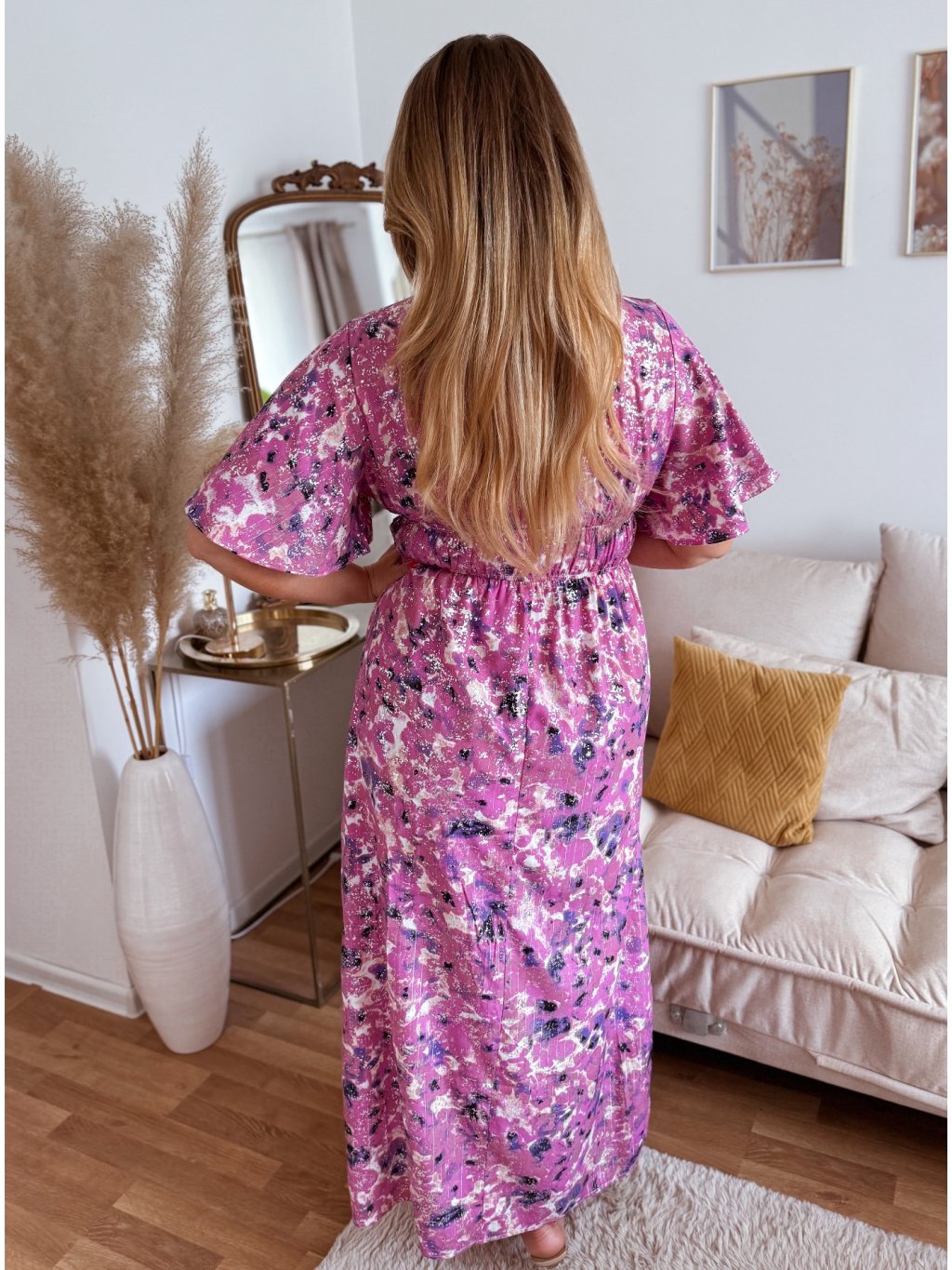 Dlouhé barevné plus size šaty s krátkými rukávy, šaty mají lehký stříbrný lesk. Dlouhé šaty mají v pase gumičku. Modelka měří 168 cm a má na sobě velikost XL.