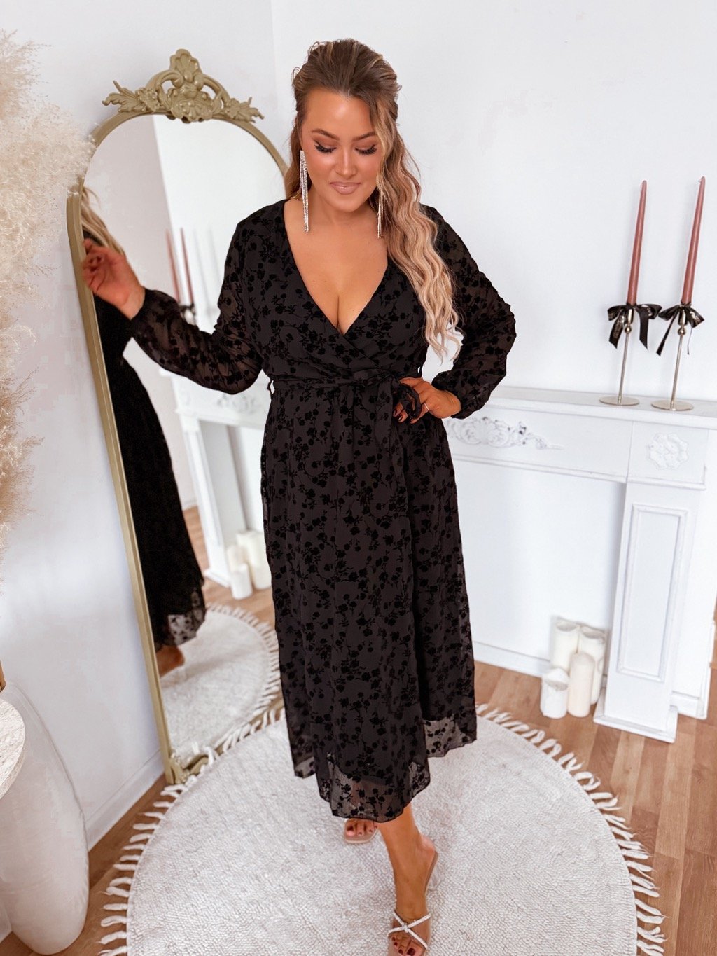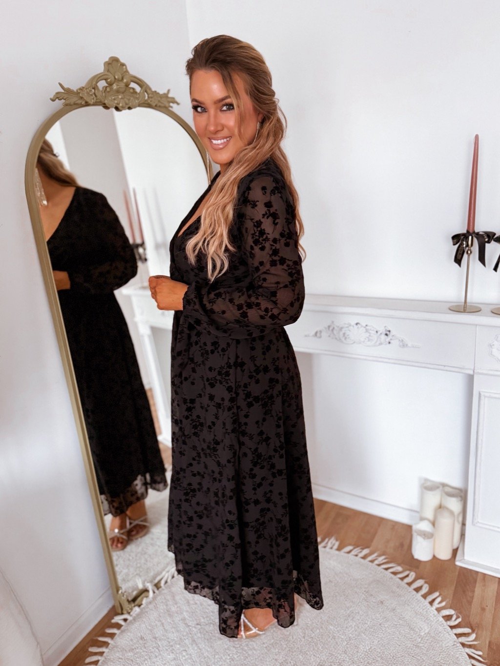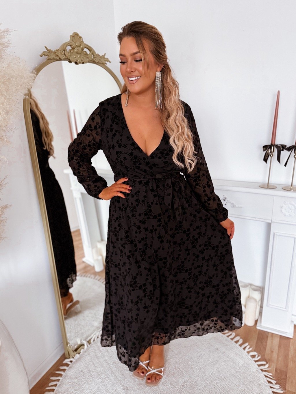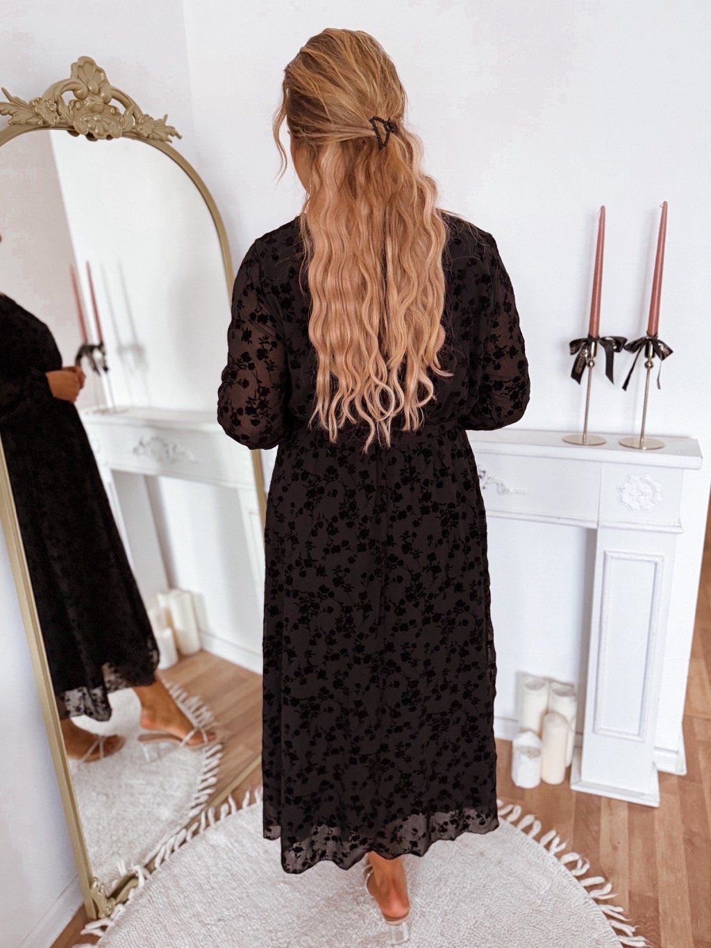 Dlouhé elegantní dámské šaty mají sametový vzor na látce. Mají gumičku v pase. Šaty jsou od pasu dolů volné. Modelka měří 168 cm a má na sobě velikost XL/XXL.