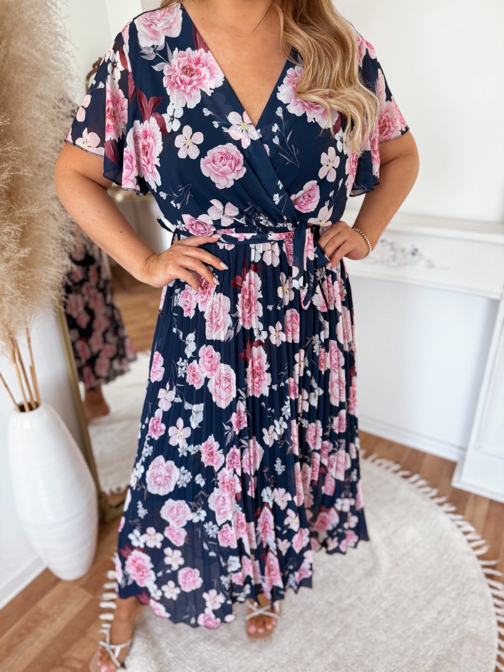 Elegantní dlouhé šaty s krátkými rukávy a volnou sukní. Šaty mají v pase všitou elastickou gumičku. Díky výraznému květinovému vzoru jsou tyto šaty dokonalou volbou pro letní oslavy, svatby či dovolené. Modelka měří 168 cm a má na sobě velikost L/XL.
