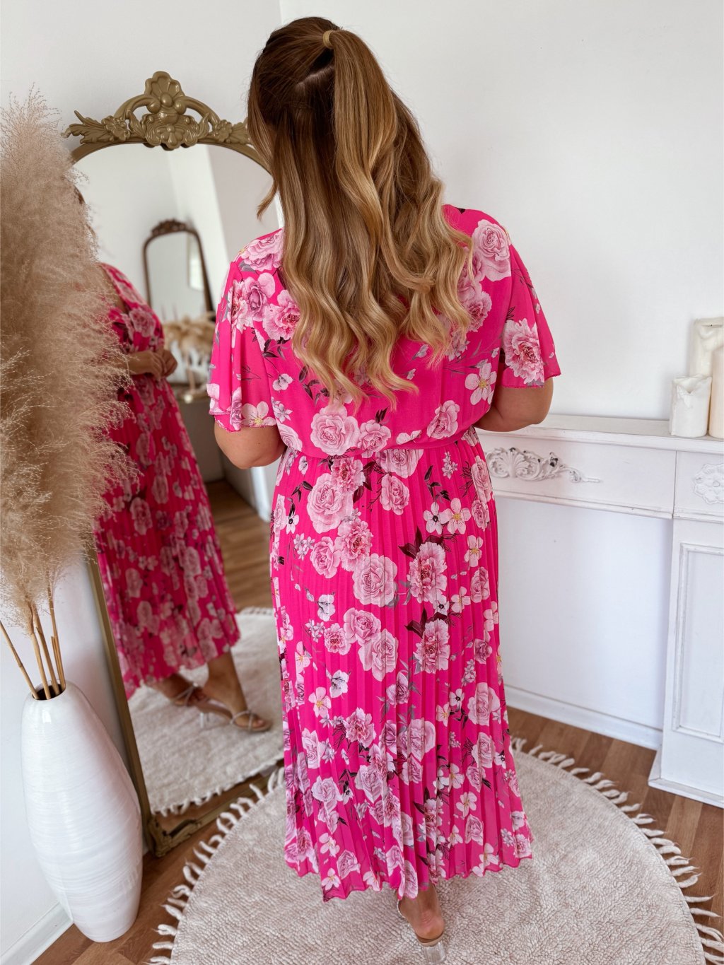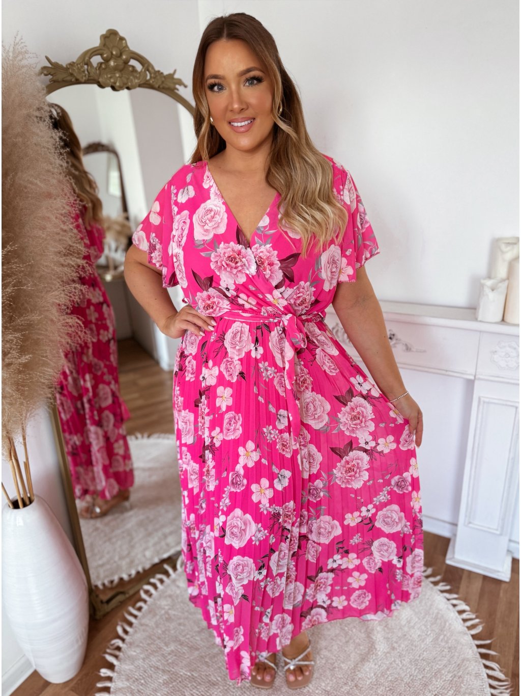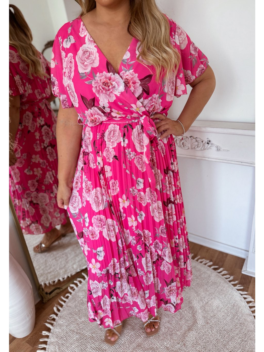 Elegantní dlouhé šaty s krátkými rukávy a volnou sukní. Šaty mají v pase všitou elastickou gumičku. Díky výraznému květinovému vzoru jsou tyto šaty dokonalou volbou pro letní oslavy, svatby či dovolené. Modelka měří 168 cm a má na sobě velikost L/XL.