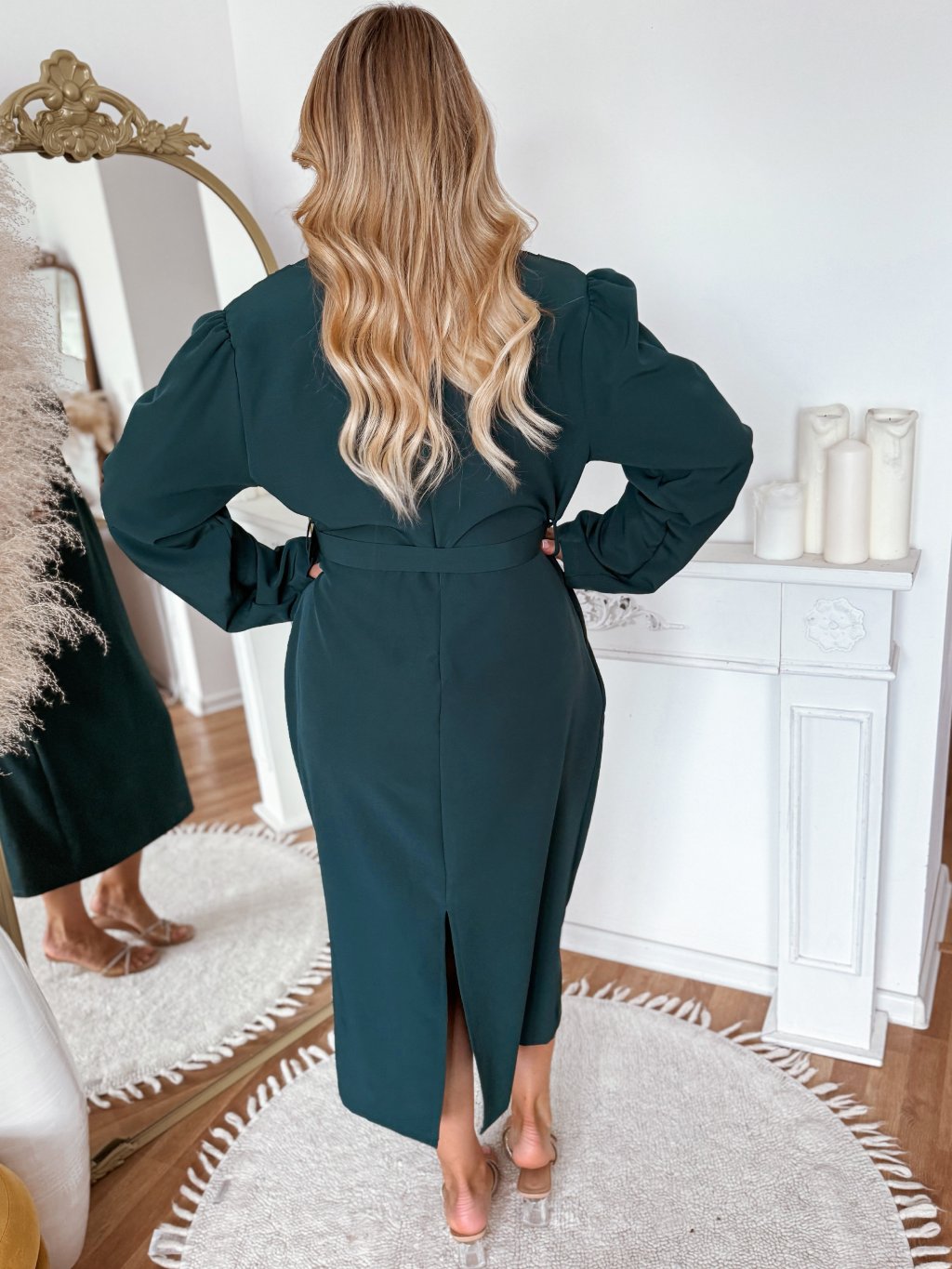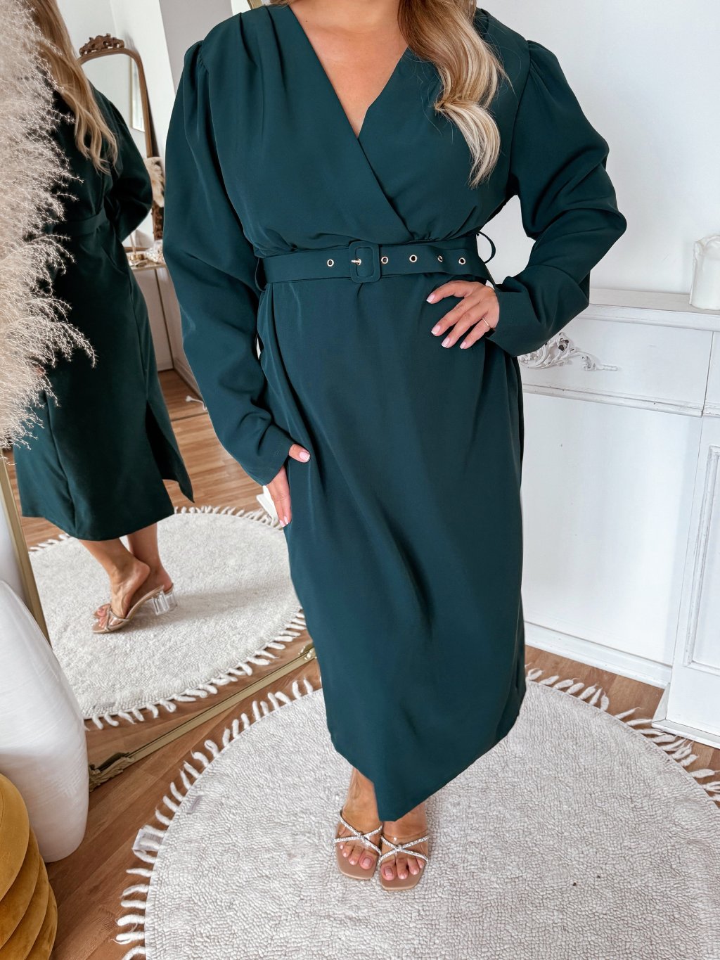Smaragdové midi šaty s páskem a dlouhým rukávem
