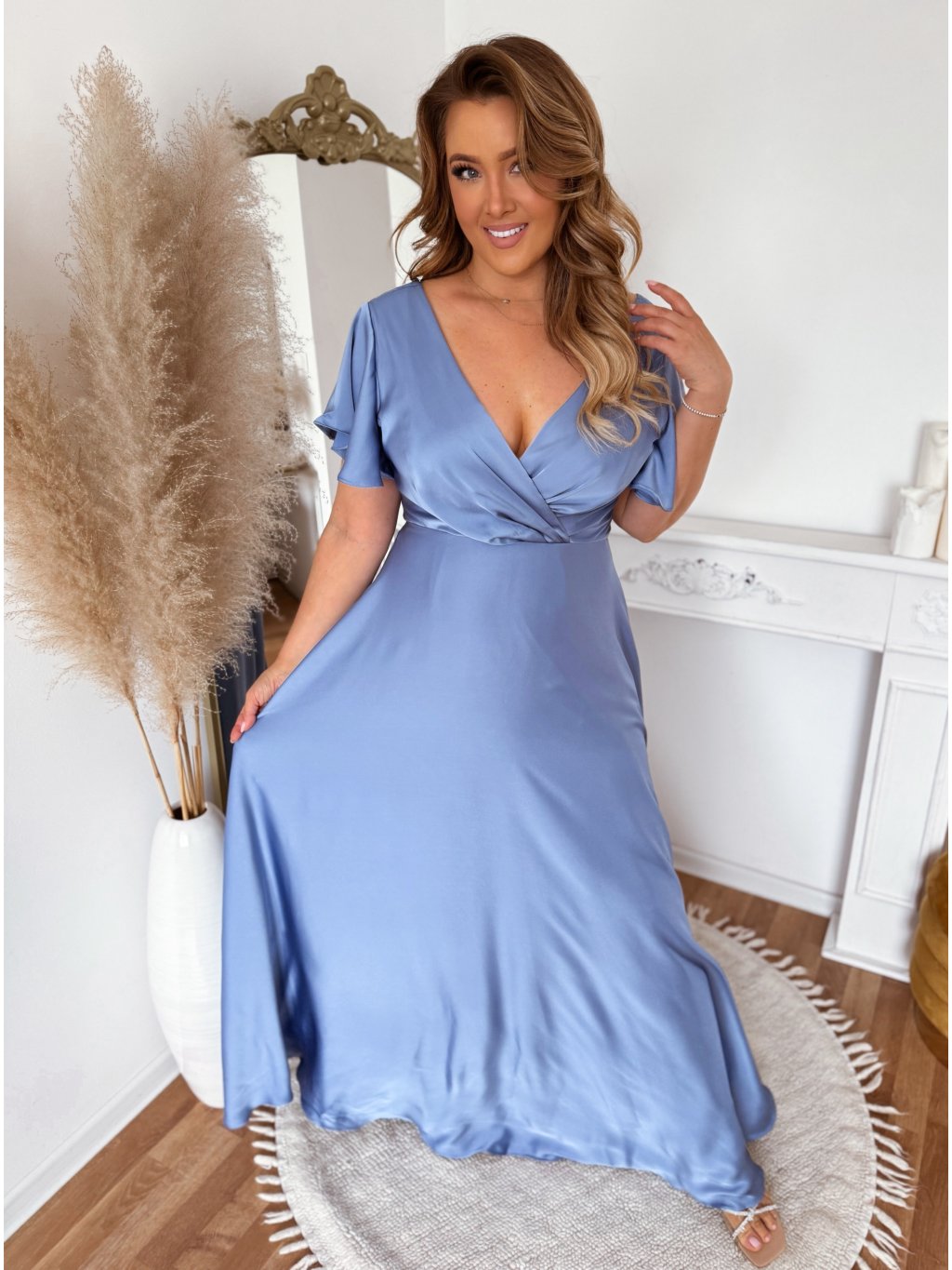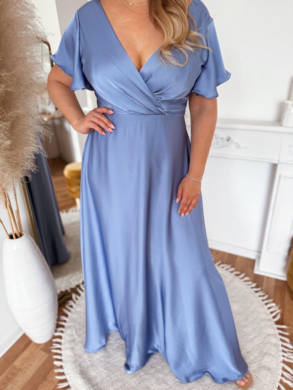 Dlouhé společenské maxišaty s hlubokým výstřihem a krátkým rukávem. Společenské šaty pro plnoštíhlé mají zapínání na zip na zádech. Sukně je zcela volná. Modelka je 168 cm vysoká a má na sobě velikost XL (42).