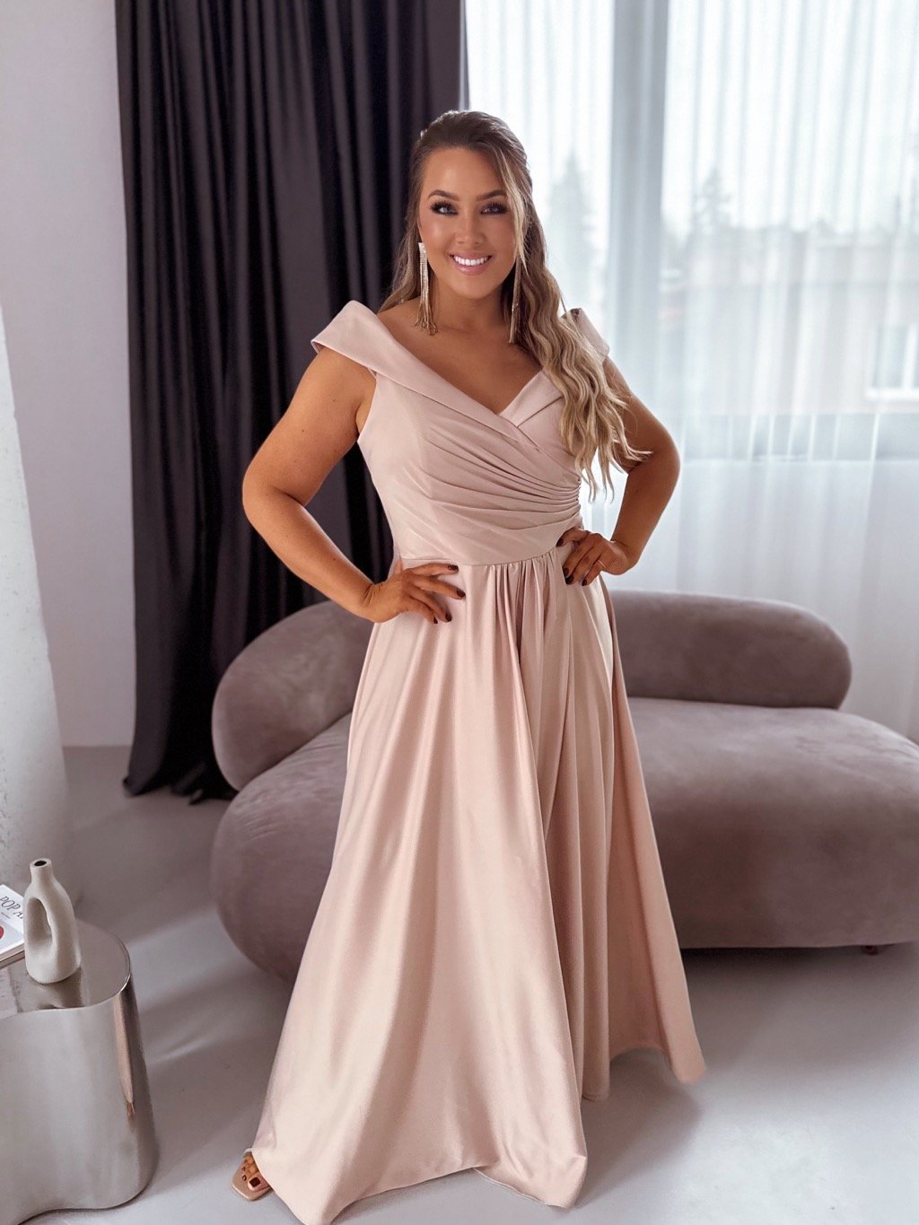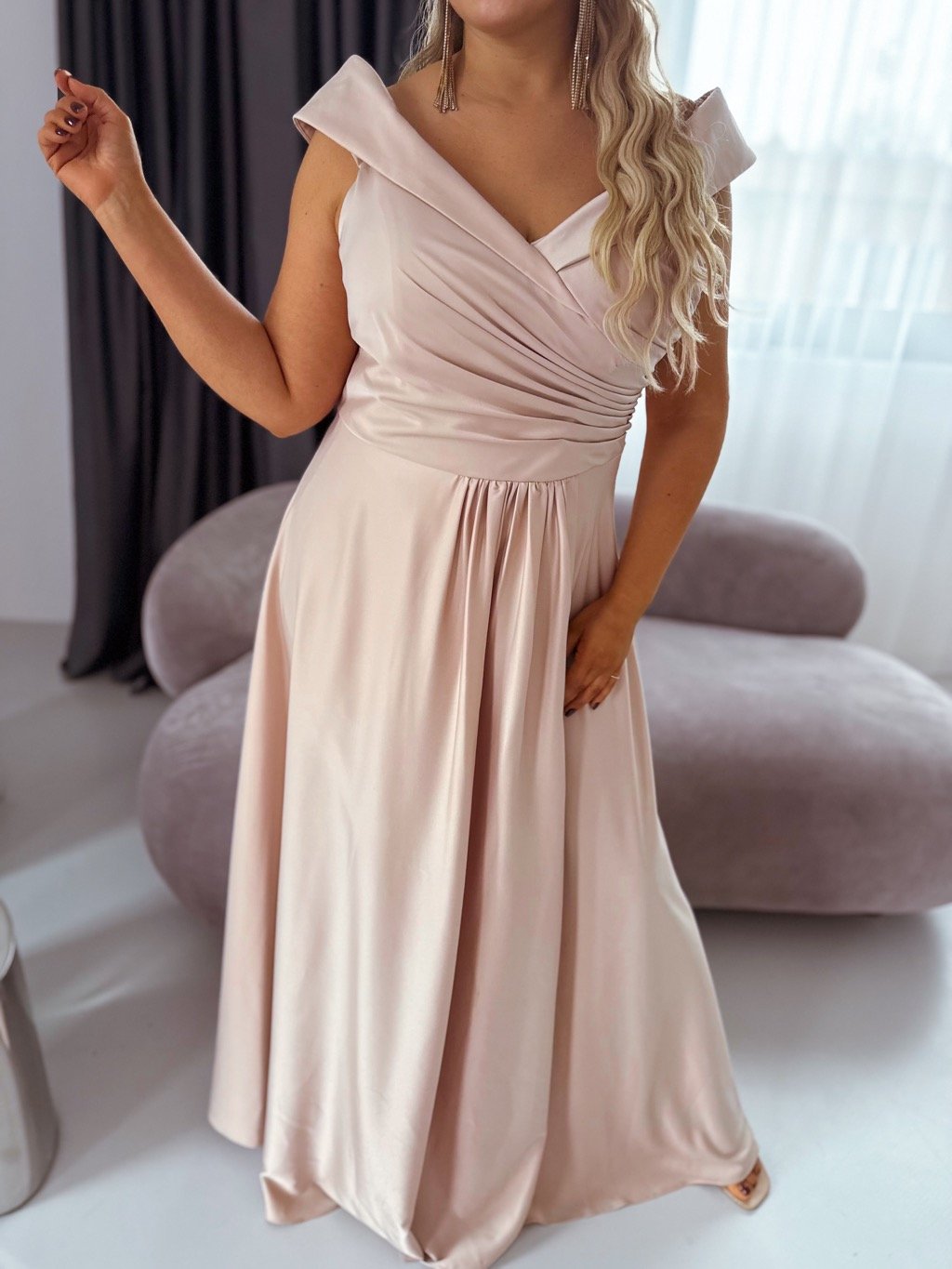 Dlouhé společenské šaty jsou mírně elastické, látka má saténový lesk. Na zadní straně je zapínání na zip. Šaty mají na hrudi měkké pěnové vycpávky. Modelka měří 168 cm a má na sobě velikost XL.
