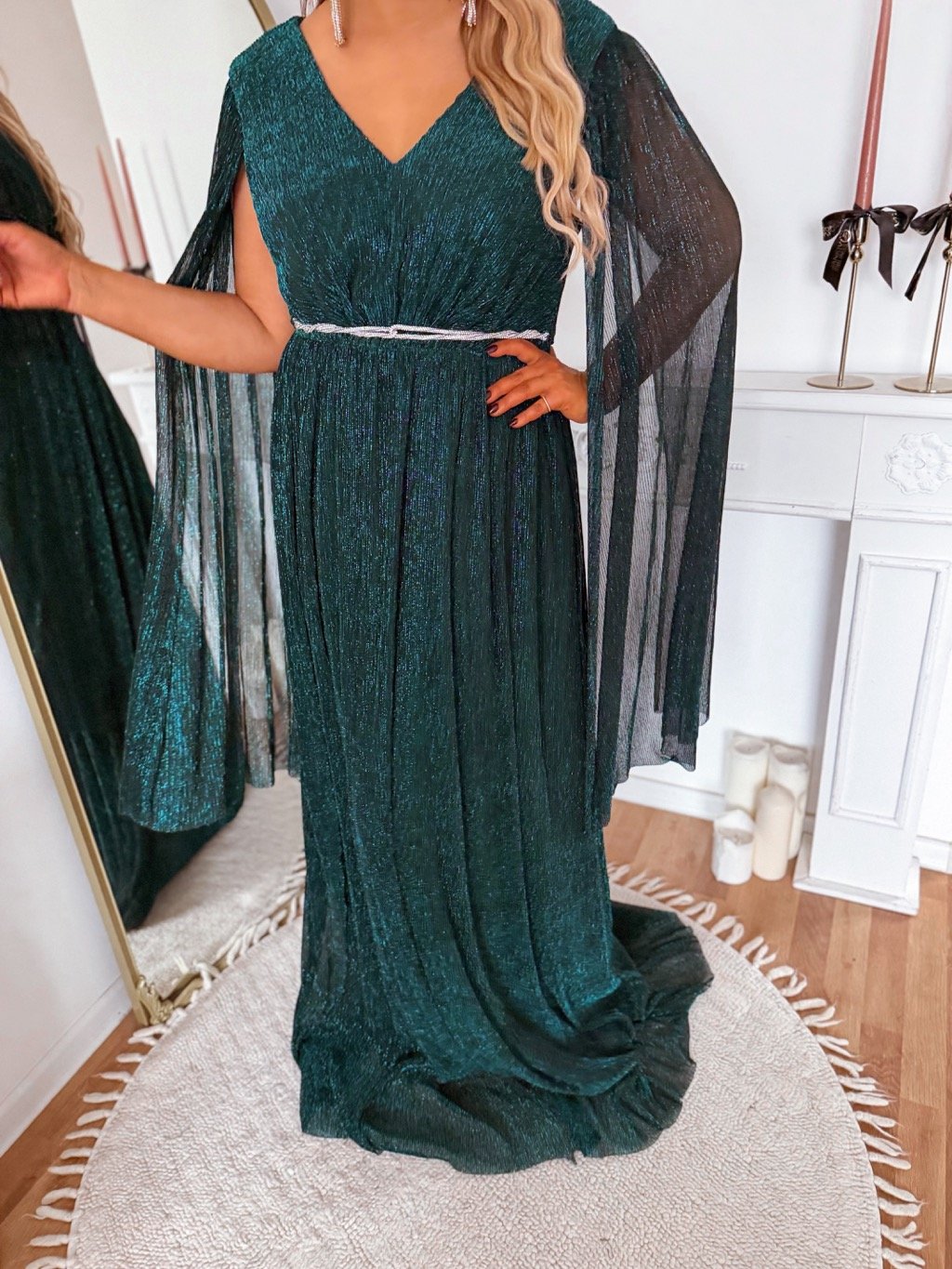 Večerní šaty s dramatickými rukávy a našitým ozdobným páskem ve stříbrné barvě. Šaty mají volnější střih a elastický pas. Modelka je 168 cm vysoká a má na sobě velikost XL (42).
