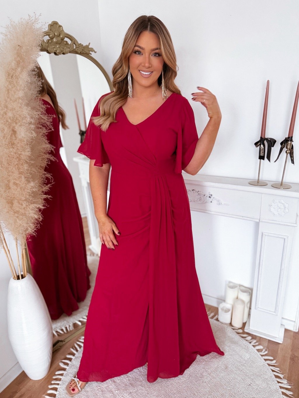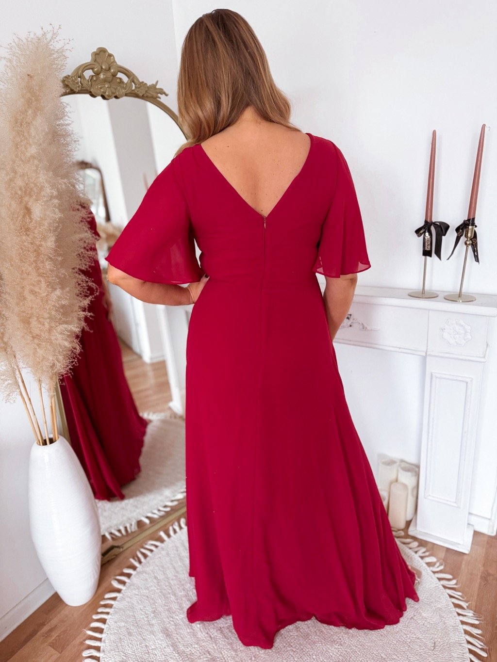 Dlouhé společenské šaty pro plnoštíhlé s krátkým rukávem. Šaty mají na zádech zip a na hrudi měkkou pěnovou vycpávku. Modelka měří 168 cm a má na sobě velikost XL.