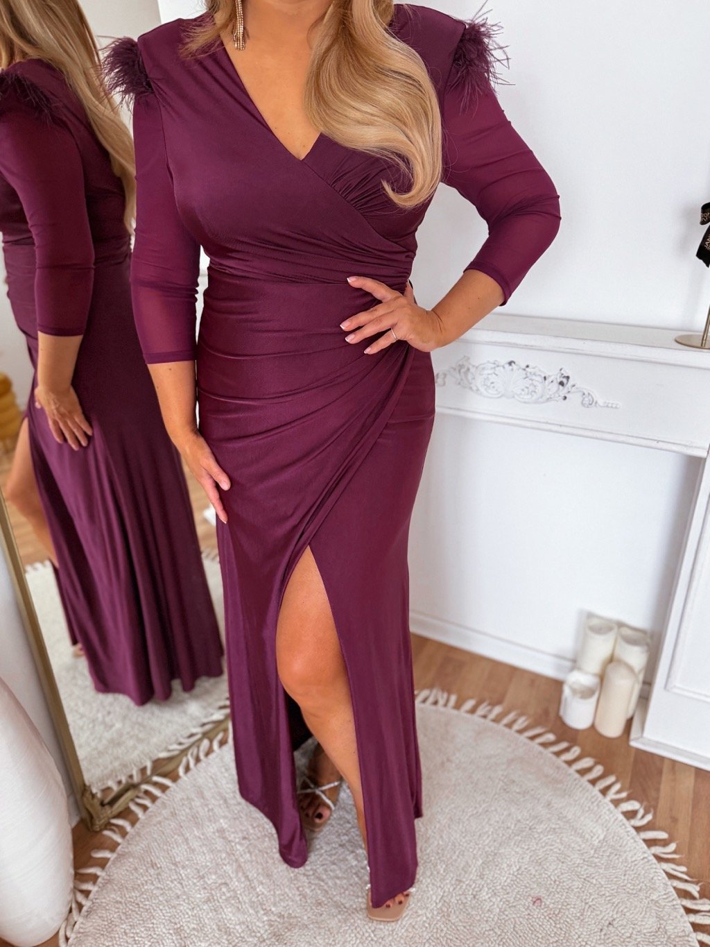 Společenské šaty jsou vyrobeny z elastického materiálu, mají zip na zádech a jemnou výztuž na prsou. Modelka měří 168 cm a má na sobě velikost XL/2XL.