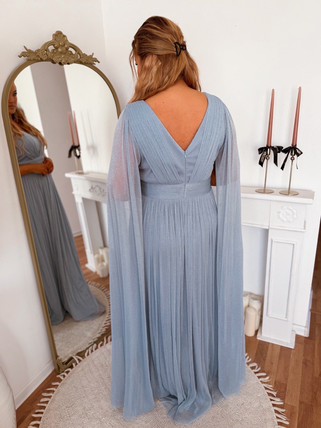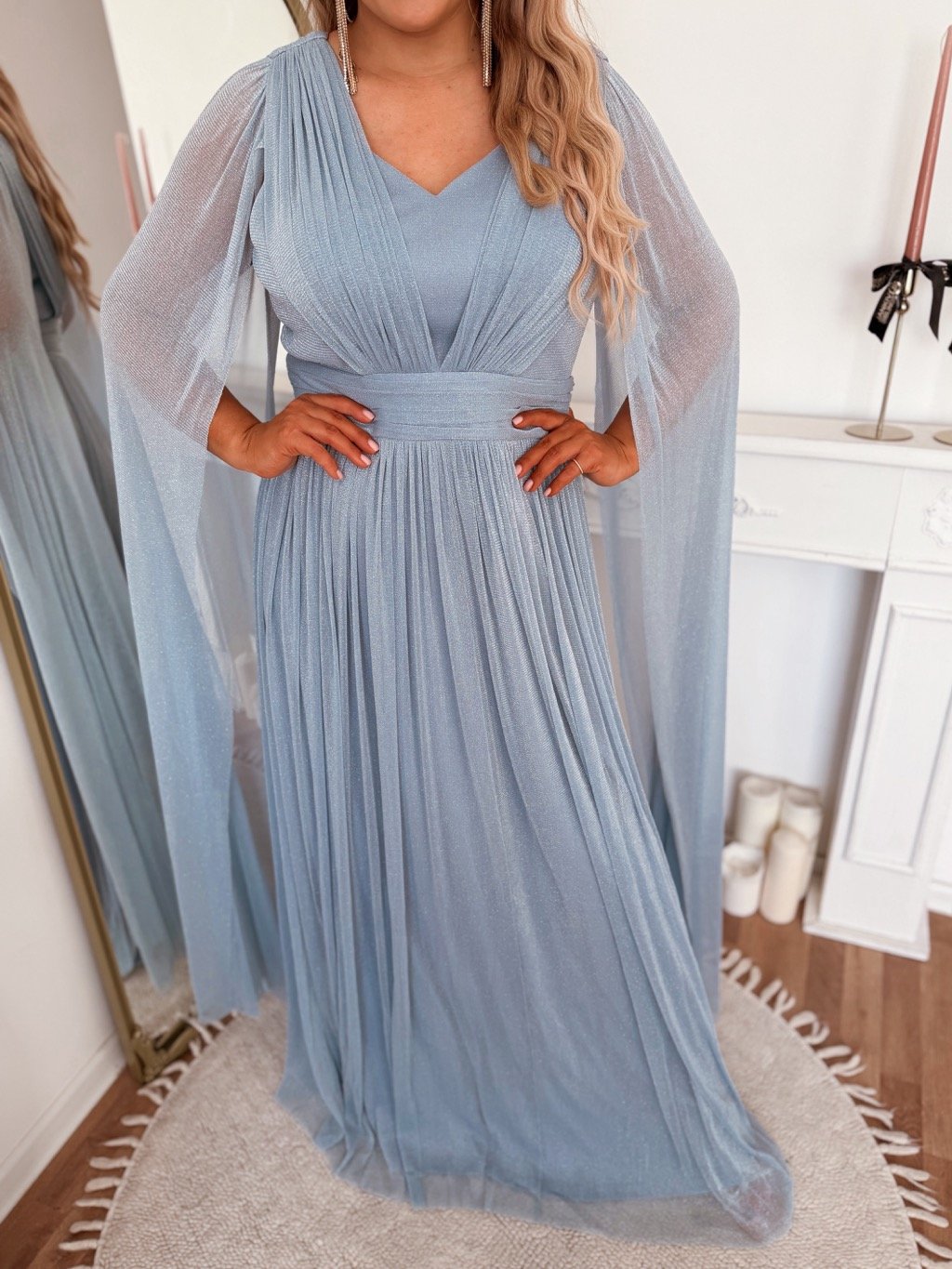 Světle modré společenské šaty s maxi rukávy