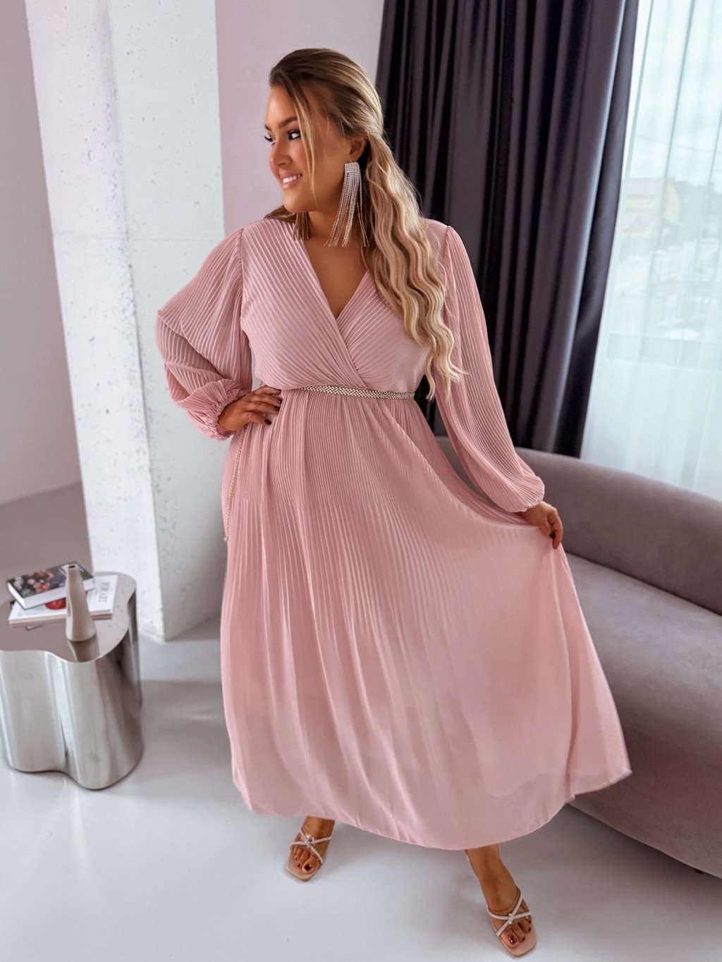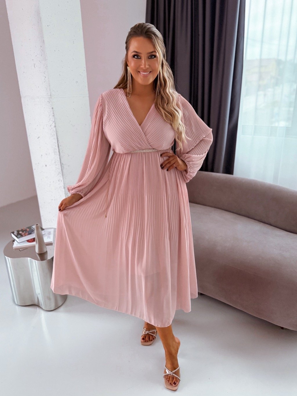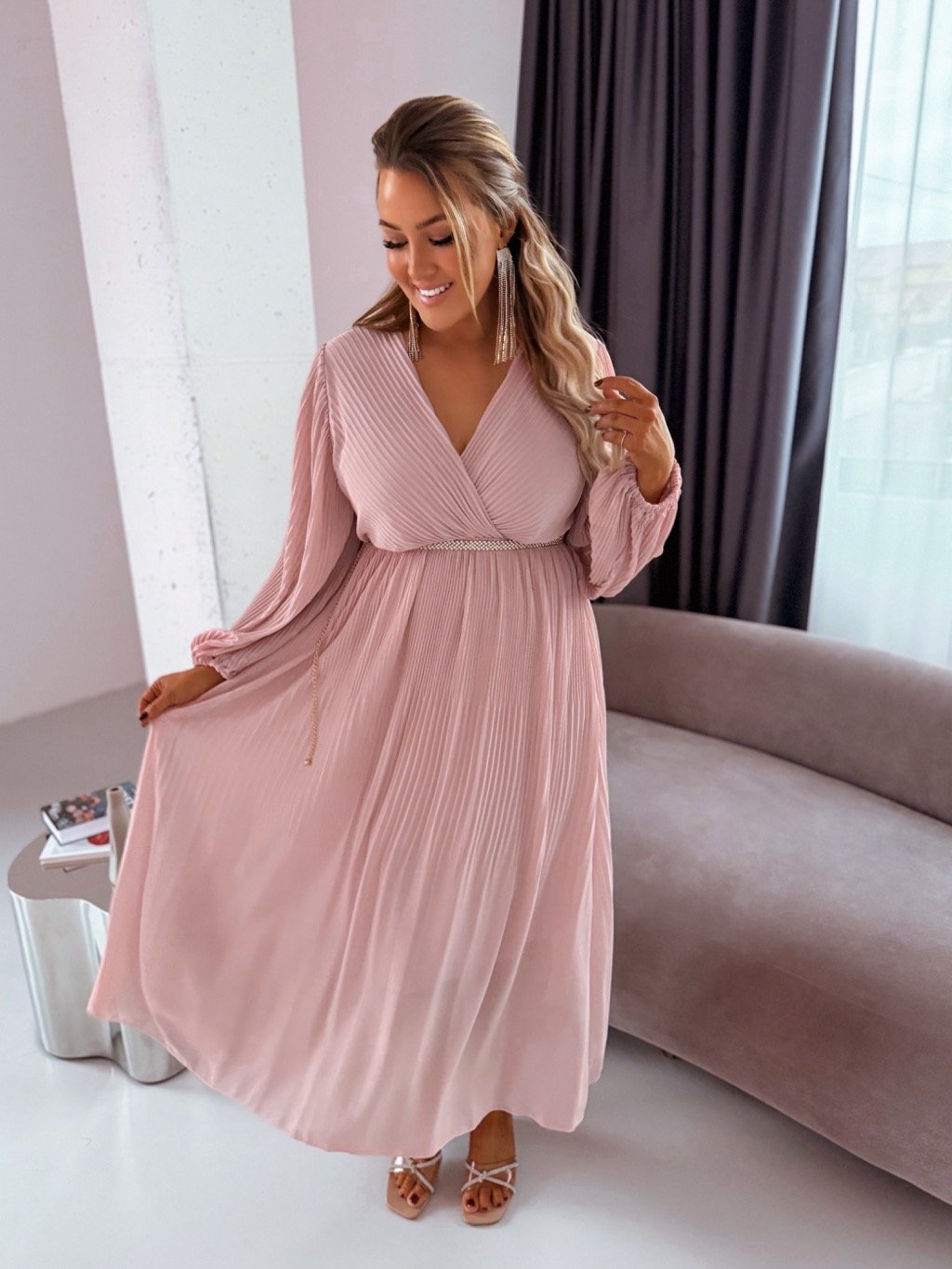 Elegantní plisované šaty s dlouhými rukávy mají volnější střih a pružný pásek v pase. Třpytivý pásek není součástí šatů, najdete ho mezi doplňky. Šaty jsou na bocích zcela volné. Modelka měří 168 cm a má na sobě velikost L/XL.