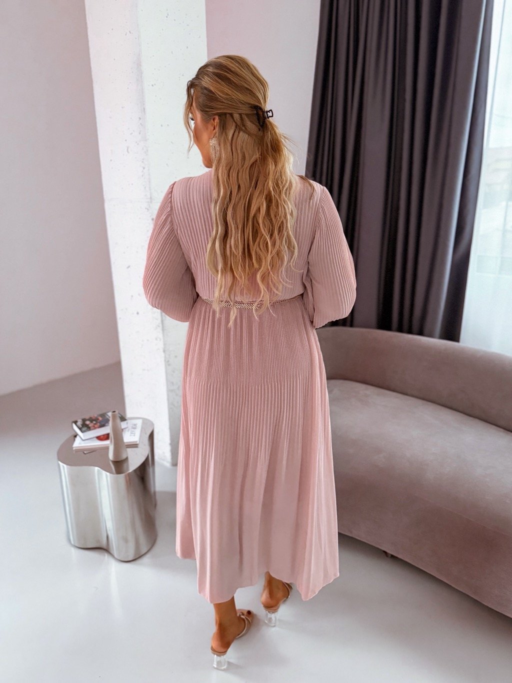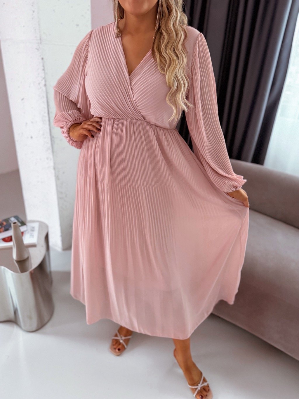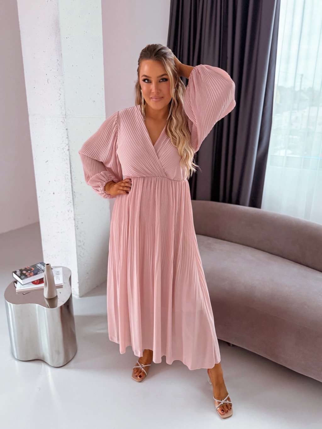 Elegantní plisované šaty s dlouhými rukávy mají volnější střih a pružný pásek v pase. Třpytivý pásek není součástí šatů, najdete ho mezi doplňky. Šaty jsou na bocích zcela volné. Modelka měří 168 cm a má na sobě velikost L/XL.