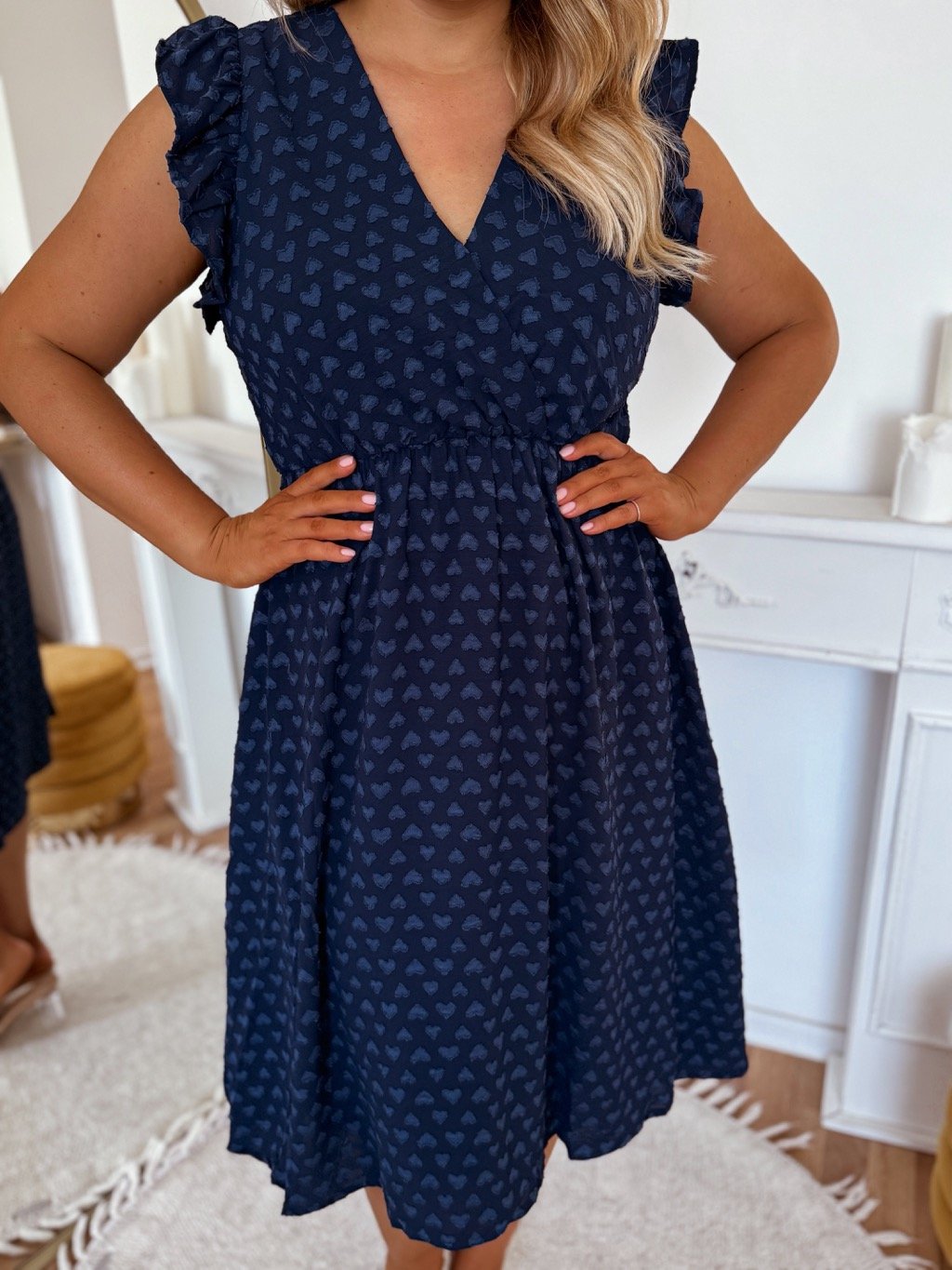 Dámské šaty pod kolena se srdíčky na látce. Šaty s výstřihem do V a krátkými volánkovými rukávy, elastický pas. Modelka měří 168 cm a má na sobě velikost XL.