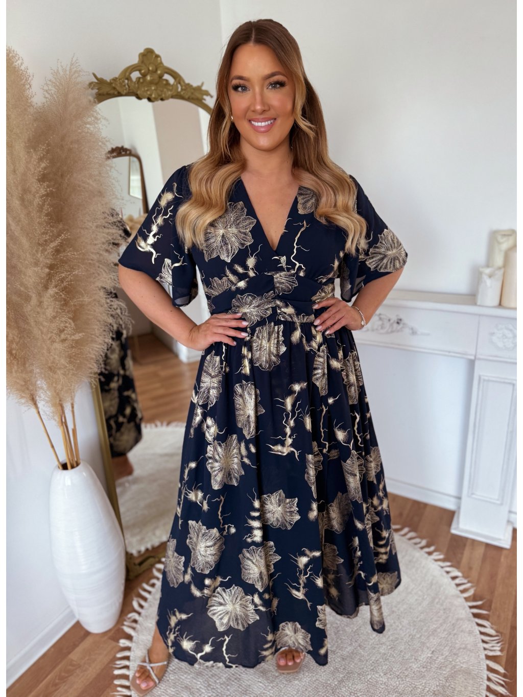 Dlouhé elegantní dámské šaty pro plnoštíhlé s krátkým rukávem a překládaným rozparkem. Šaty mají v pase gumičku. Modelka měří 168 cm a má na sobě velikost XL.