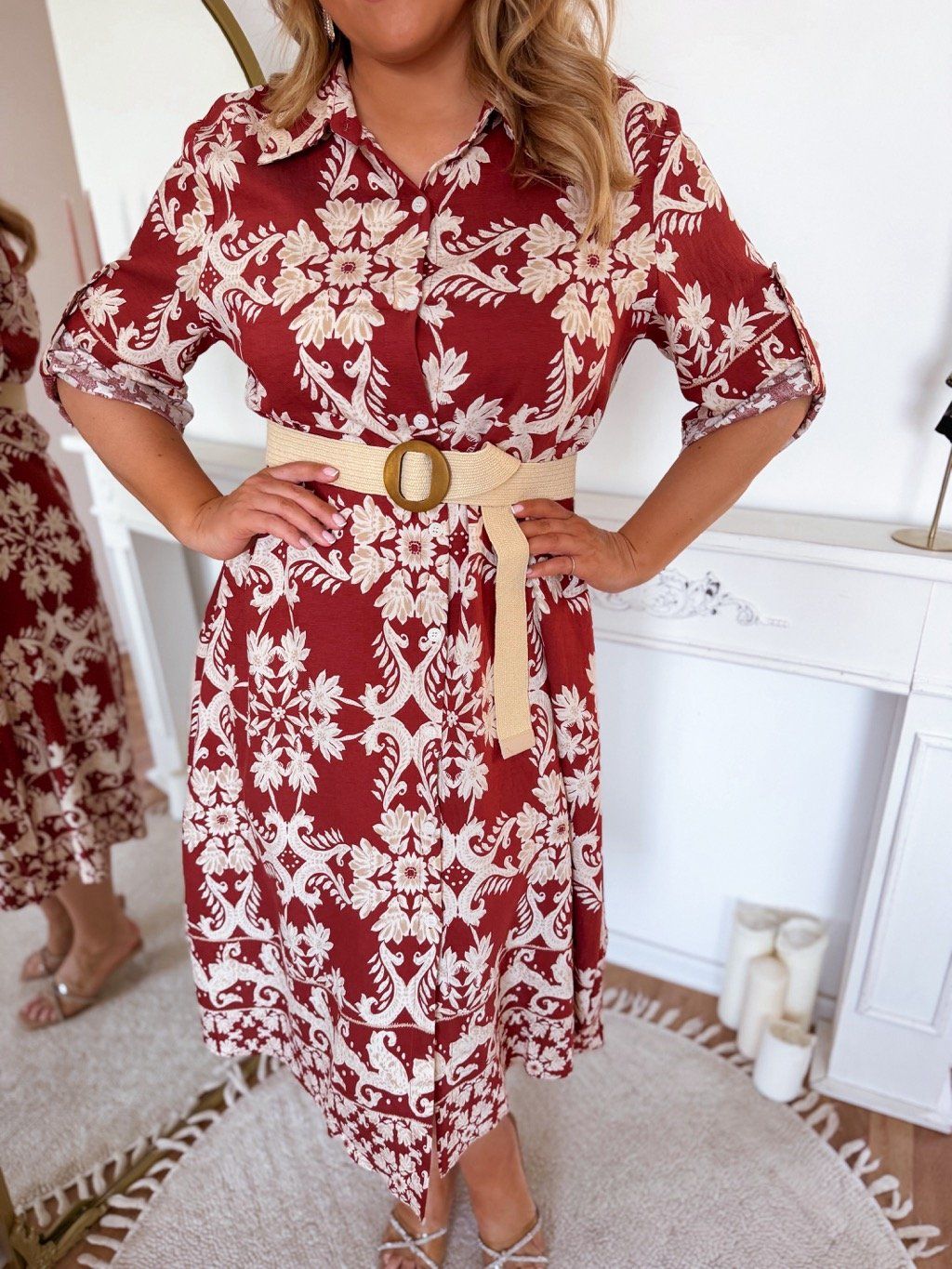 Volné košilové šaty se stahují páskem v pase. Modelka měří 168 cm a má na sobě velikost XL.
