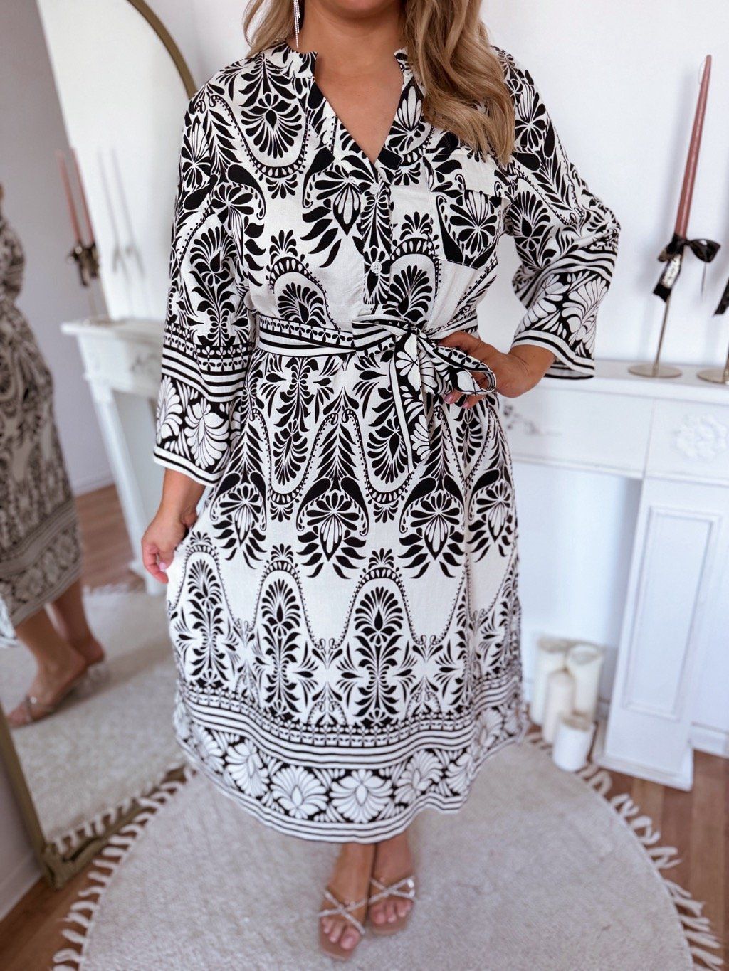 Volné košilové šaty se dvěma knoflíky na hrudi se stahují páskem v pase. Modelka měří 168 cm a má na sobě velikost XL.