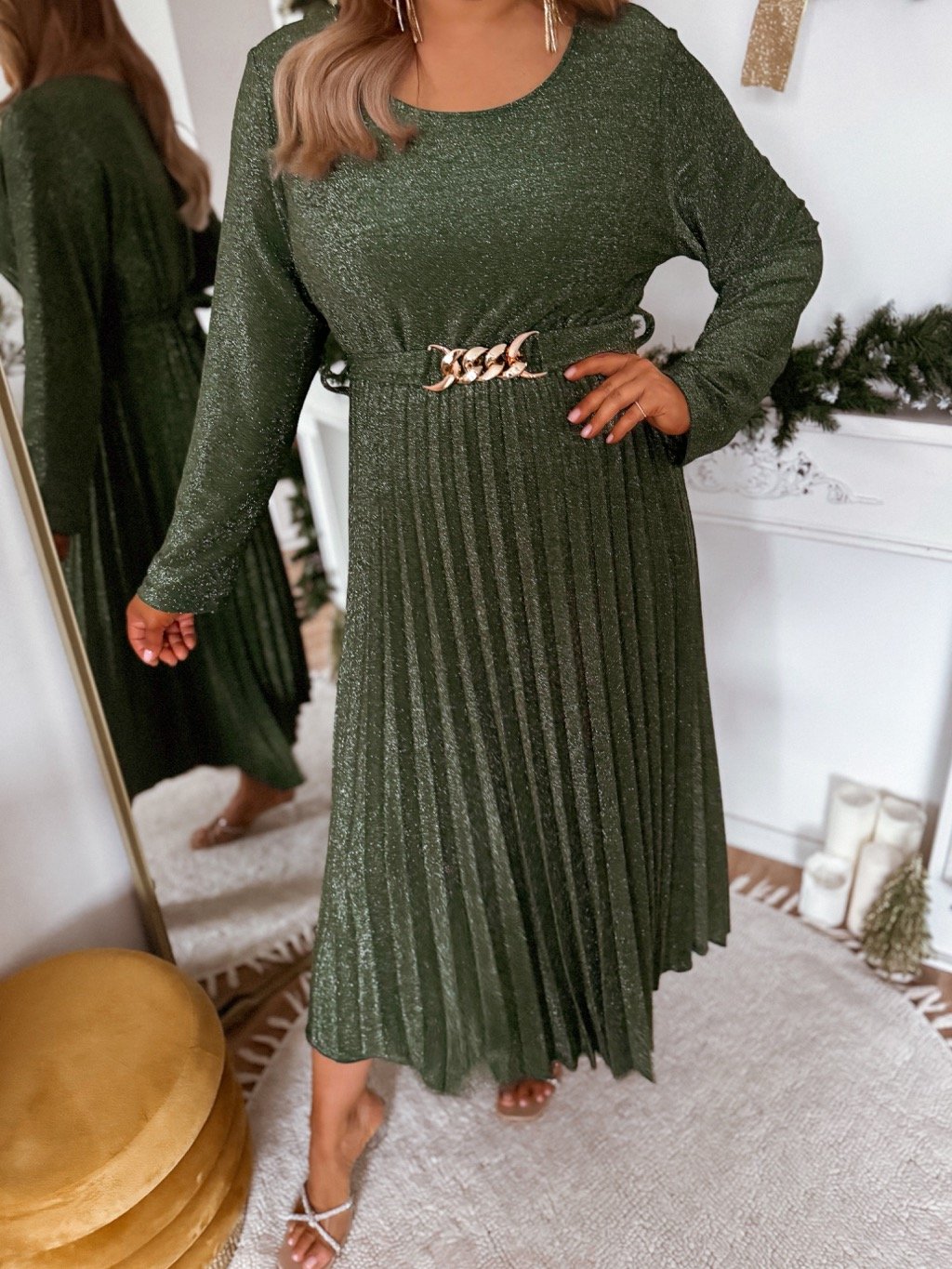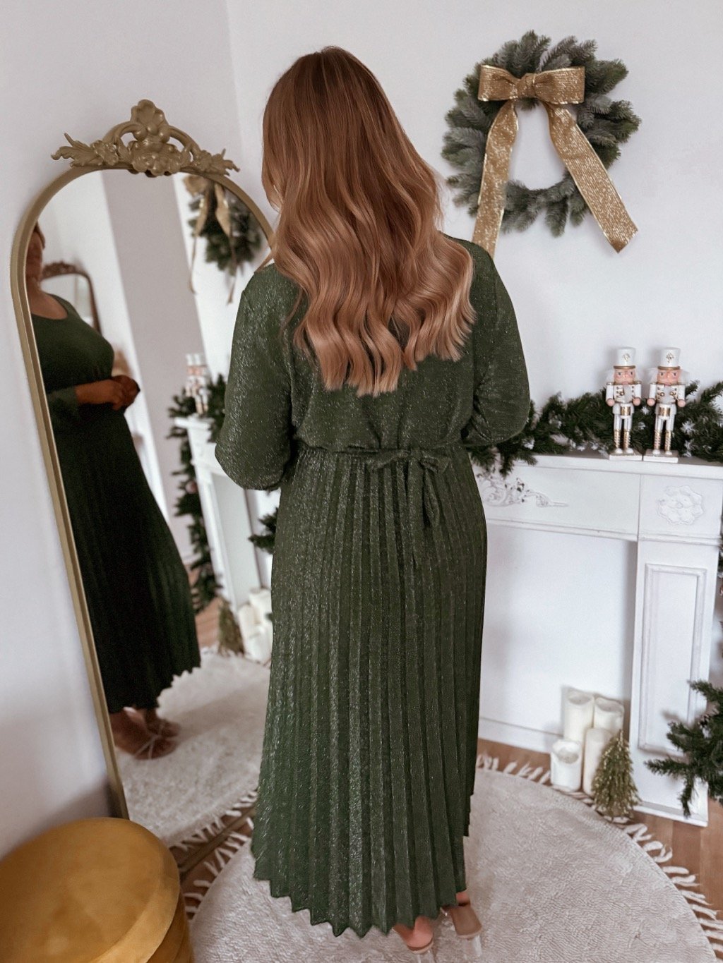 Elegantní šaty jsou vyrobeny z třpytivého materiálu, mají pásek a elastickou gumičku v pase. Šaty jsou elastické. Plisovaná sukně na šatech má volný střih. Modelka měří 168 cm a má na sobě velikost L/XL.