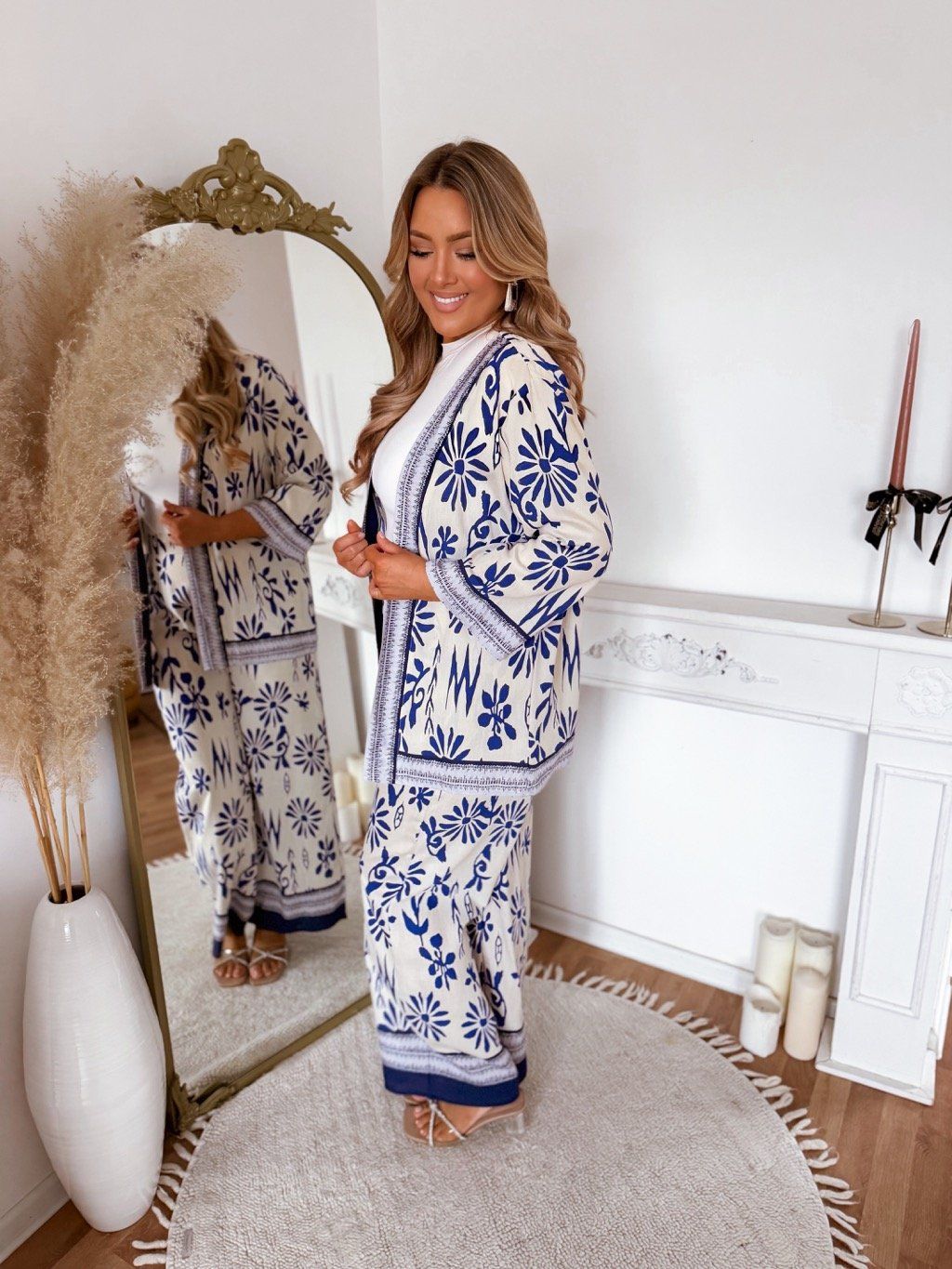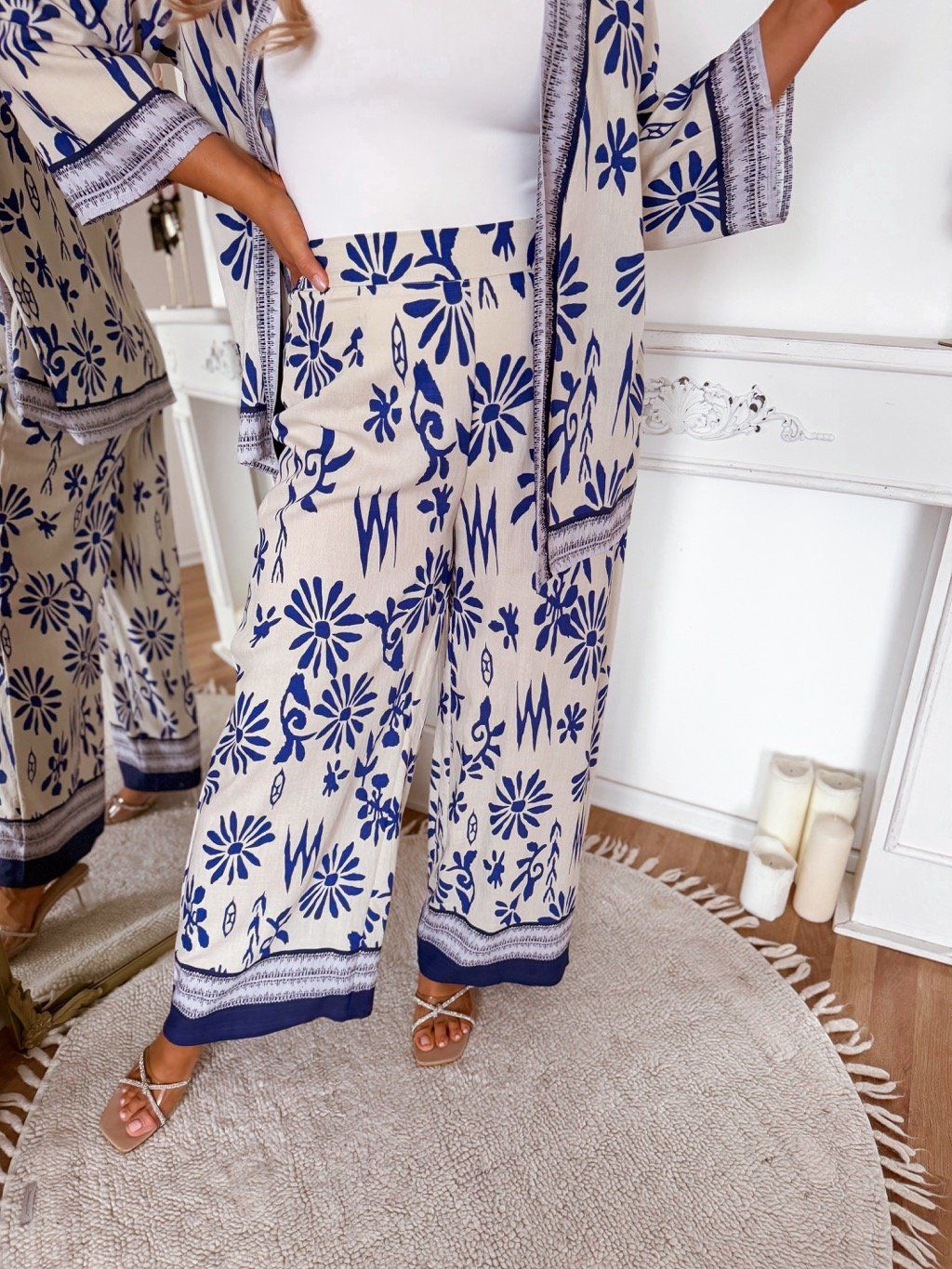 Bílo-modrá souprava kimona a širokých kalhot, kalhoty mají gumu v pase. Modelka měří 168 cm a má na sobě velikost XL.