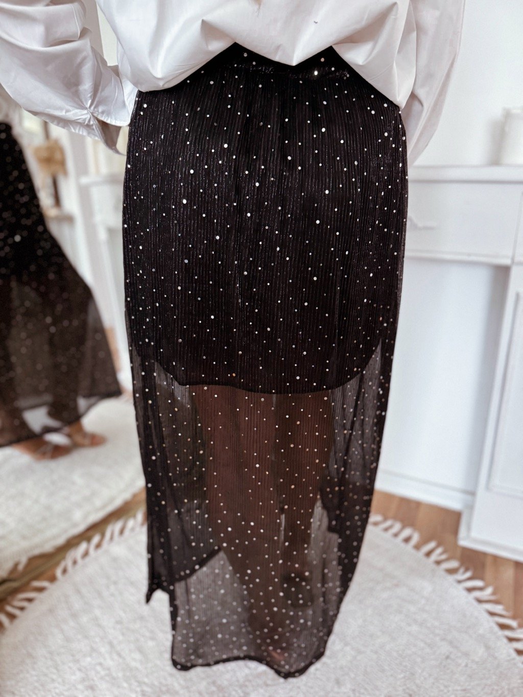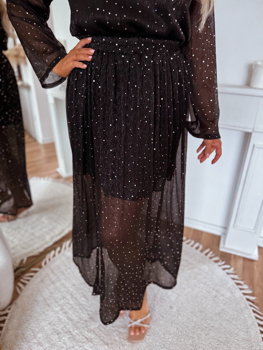 Elegantní černá sukně s elastickým pasem. Modelka měří 168 cm a má na sobě velikost L/XL.
