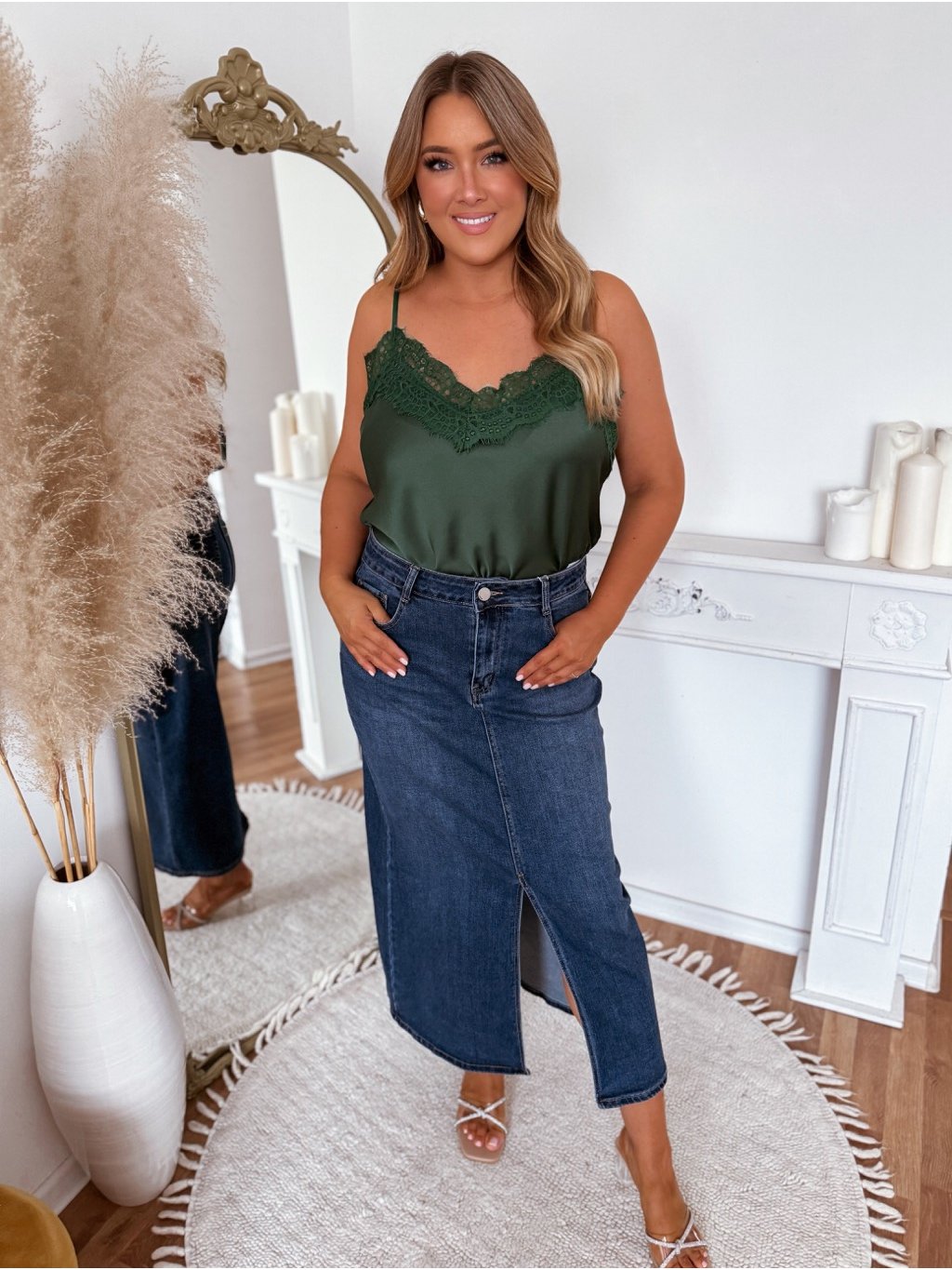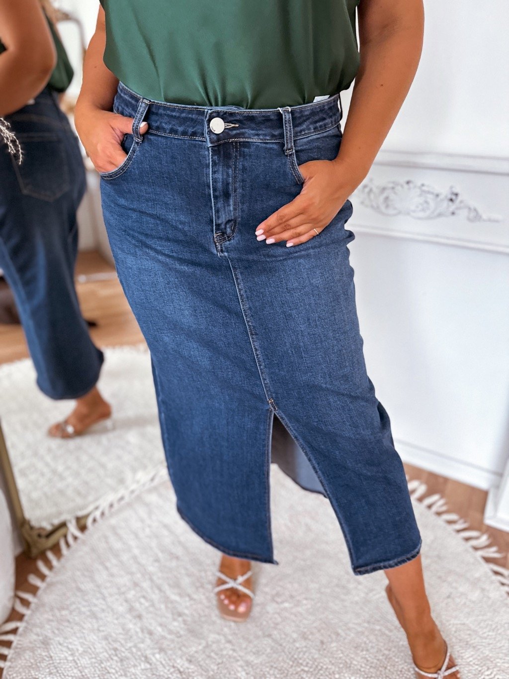 Elastická džínová sukně s rozparkem a kapsami. Modelka měří 168 cm a má na sobě velikost 42.