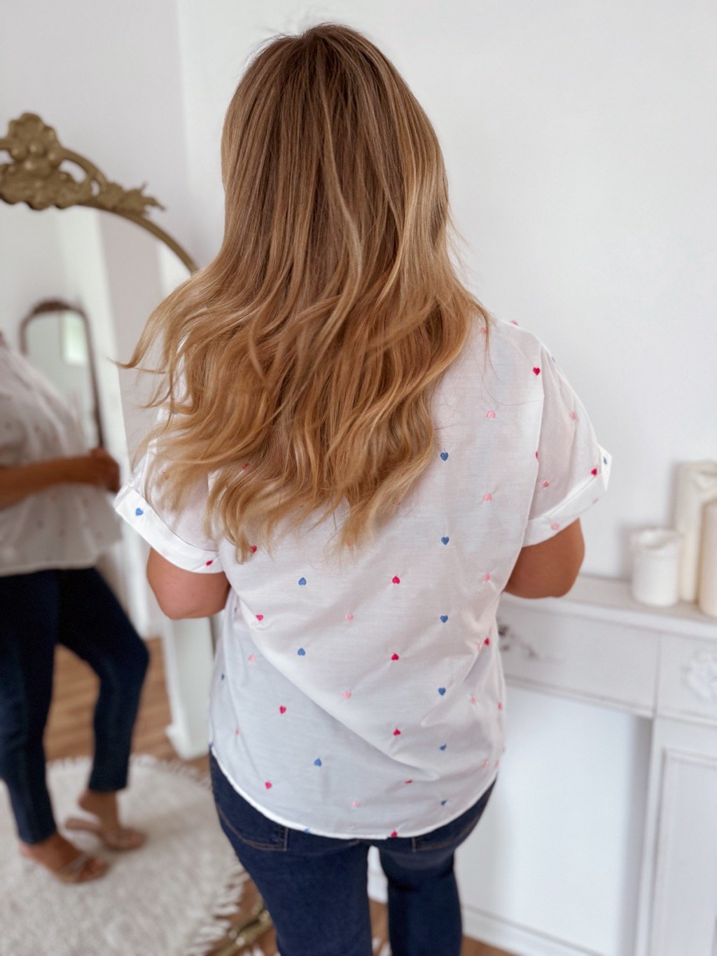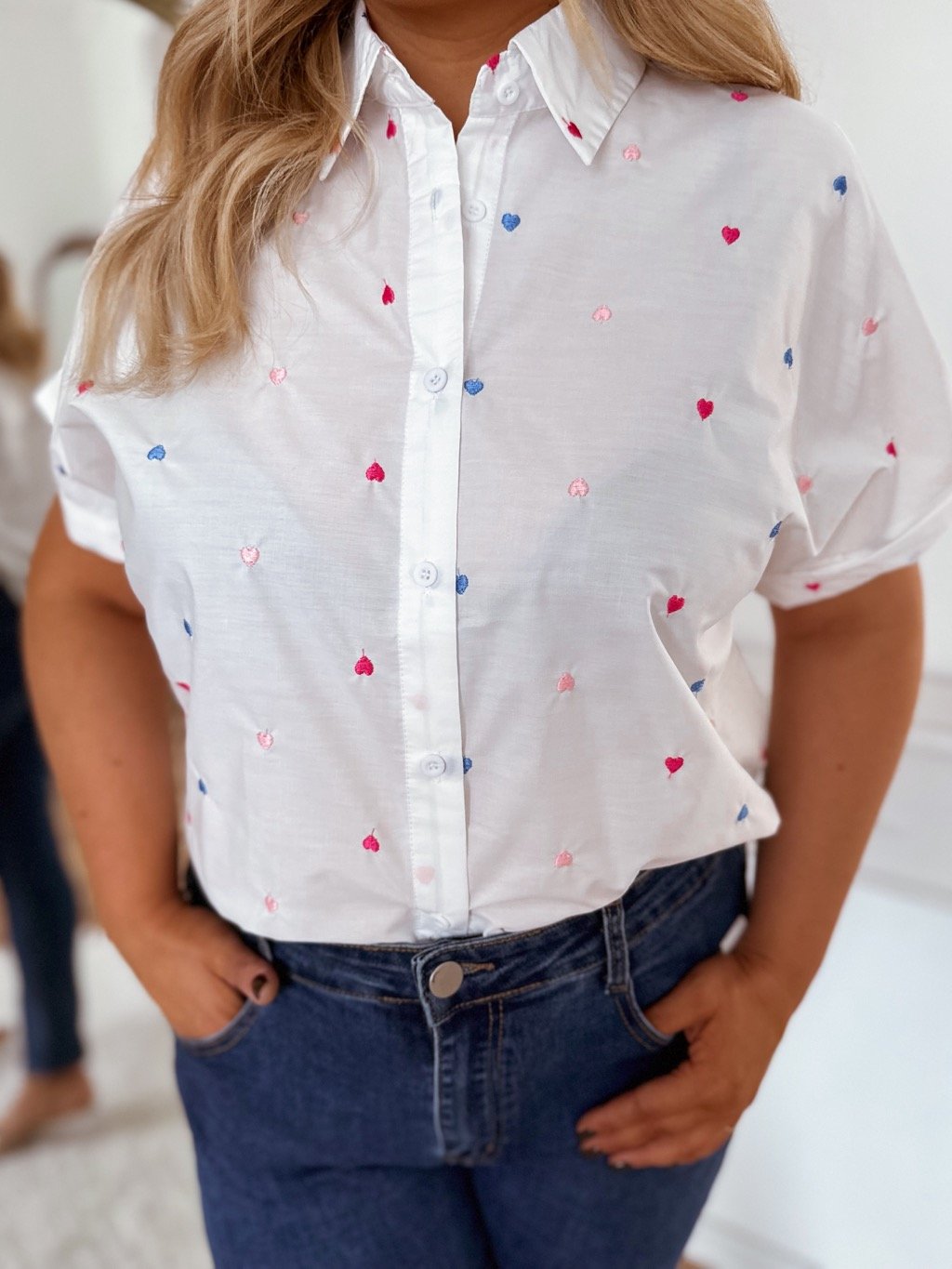 Bílá bavlněná košile s krátkým rukávem má volný střih. Modelka měří 168 cm a má na sobě velikost XL.