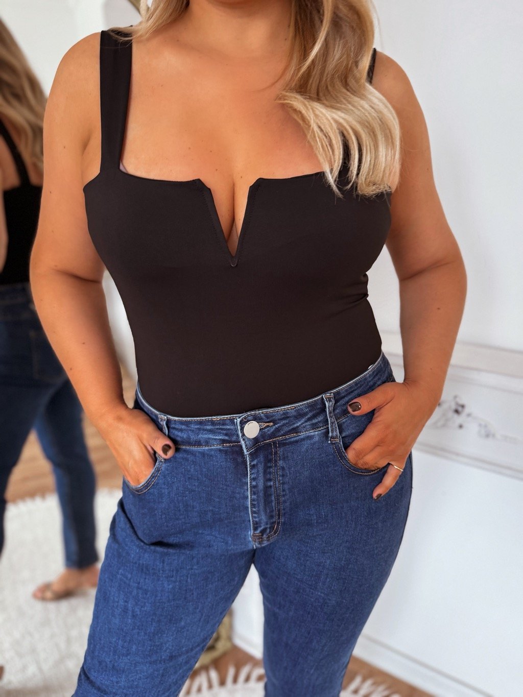Elegantní černé body s hlubokým výstřihem do tvaru V zvýrazní ženské křivky a dodá tvému outfitu šmrnc. Vyrobeno z hladkého elastického materiálu, který se přizpůsobí postavě a zajistí maximální pohodlí. Široká ramínka poskytují dokonalé zpevnění a moderní vzhled. Skvěle se kombinuje s riflemi, sukní i sakem – ideální pro běžný den i večerní nošení. Modelka měří 168 cm a má na sobě velikost XL.